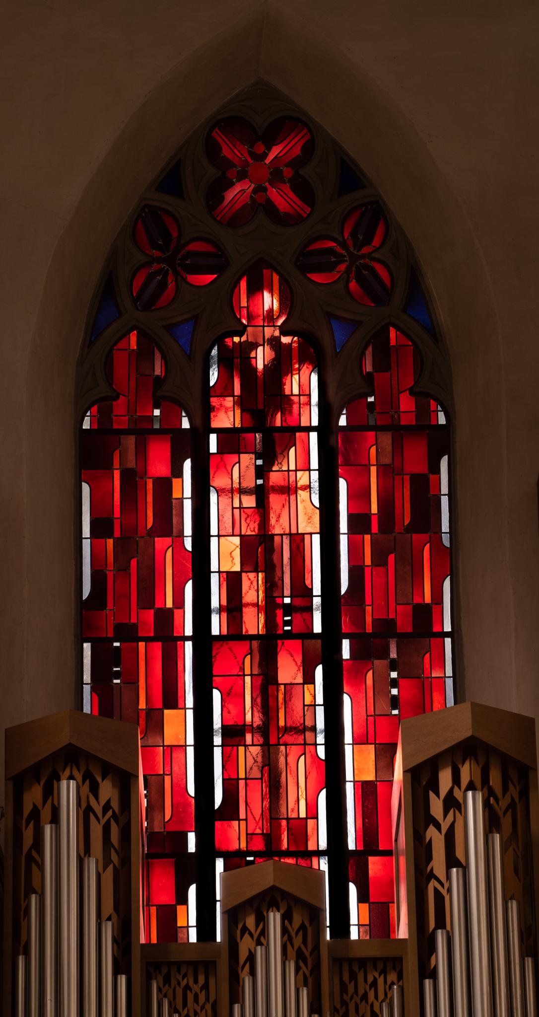 Dreilanzettiges Masswerkfenster mit schmalen, rechteckigen, roten und farblosen Glasstücken abstrakt-geometrisch gestaltet.