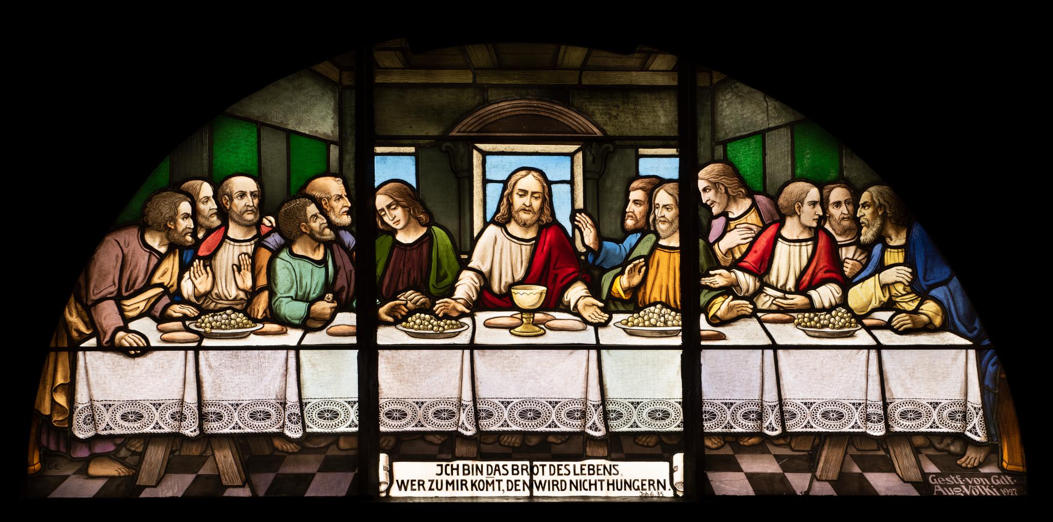 Das Lünettenfenster über dem ursprünglichen Haupteingang stiftete der Gemeinderat August Völki, nach dessen Wunsch es mit einer Darstellung des Abendmahls nach dem bekannten Wandgemälde Leonardo da Vincis im Refektorium des Dominikanerklosters Santa Maria delle Grazie in Mailand geschmückt wurde.