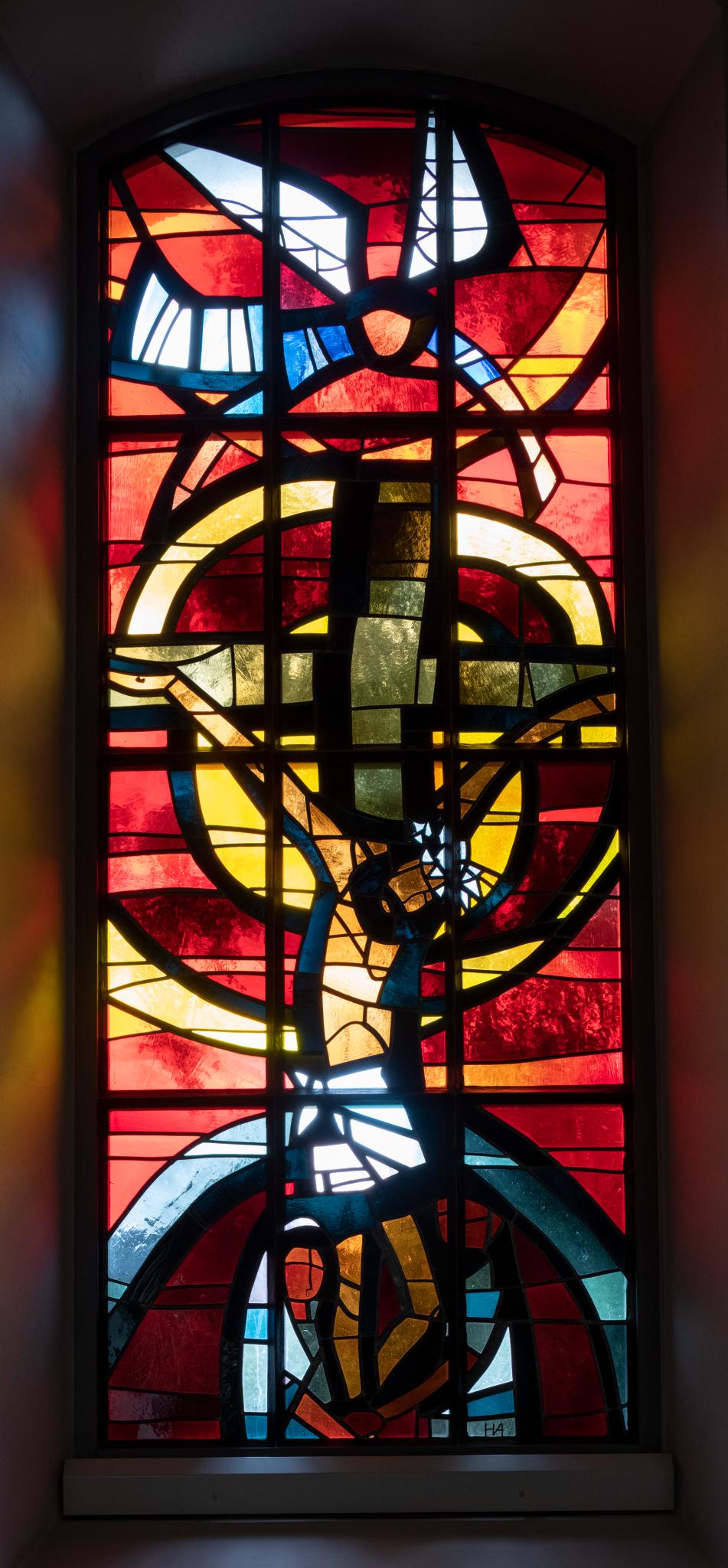 Flachbogenfenster in Rottönen. Christus am Kreuz mit Maria und Johannes. Über dem Kreuz ein Engel.