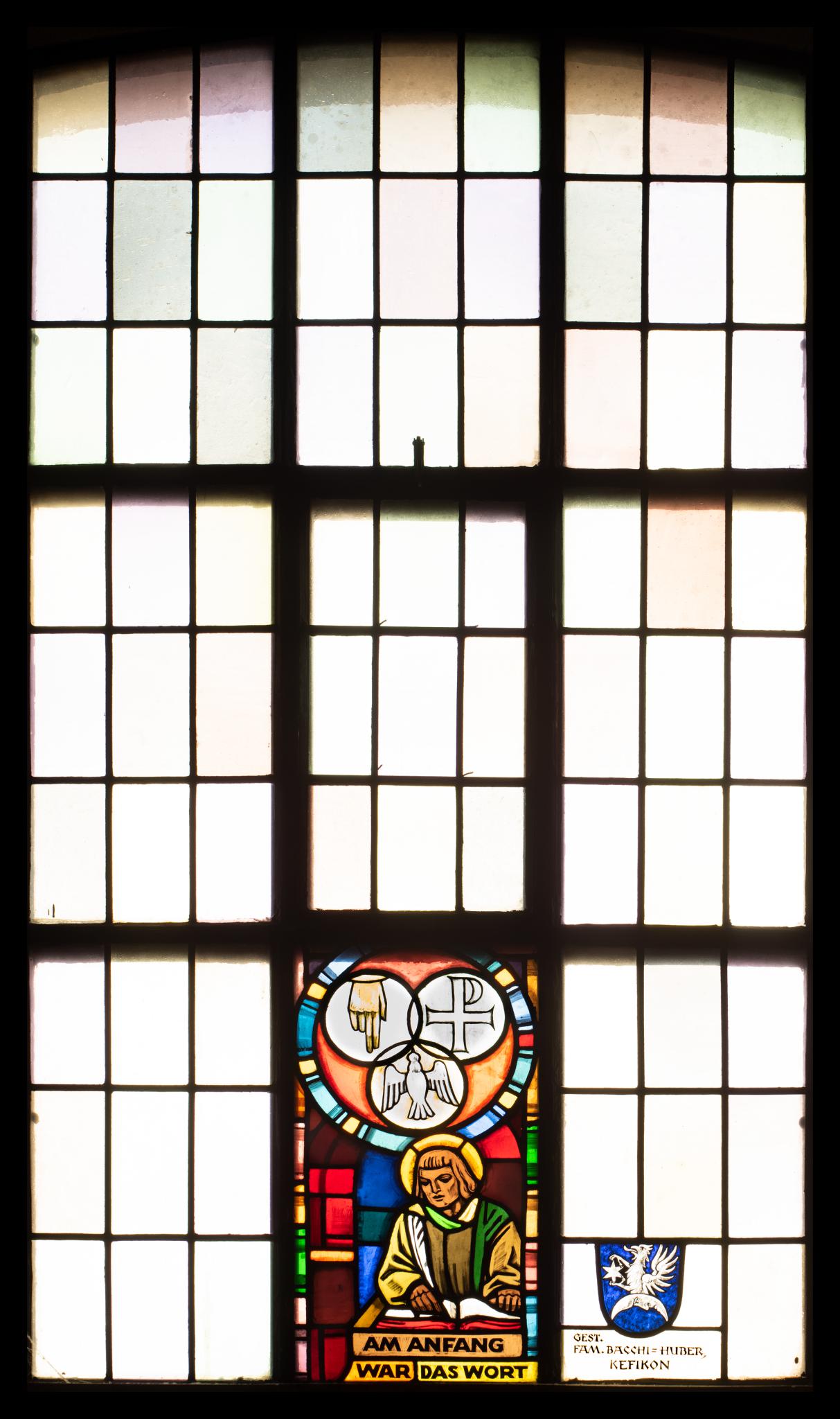 In zwölf Fenstern sind Sinnbilder des Apostolischen Glaubensbekenntnisses dargestellt. Hier steht der Evangelist Johannes für das Neue Testament und damit für den im Credo genannten Sohn Gottes, Jesus Christus. Über dem schreibenden Evangelisten ist die Dreifaltigkeit als Symbole in Medaillons dargestellt.