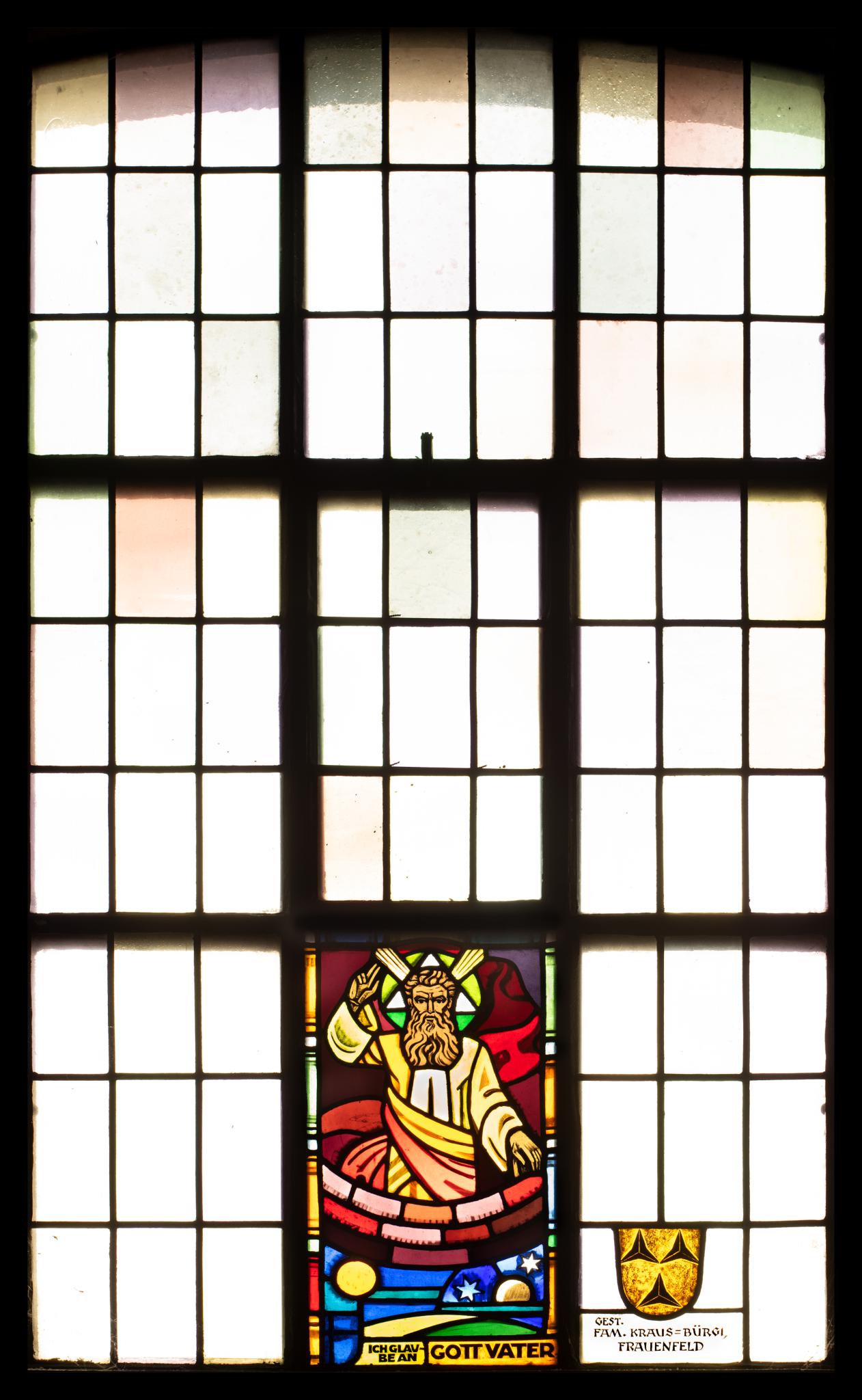 In zwölf Fenstern sind Sinnbilder des Apostolischen Glaubensbekenntnisses dargestellt. Hier ist der Glaube an Gottvater, wie er im Credo genannt wird, dargestellt. Gottvater erscheint im Himmel, darunter die Gestirne. Hinter seinem Kopf ist das Dreifaltigkeits-Dreieck zu sehen.