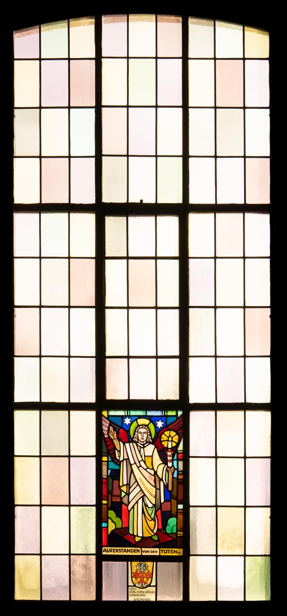 In zwölf Fenstern sind Sinnbilder des Apostolischen Glaubensbekenntnisses dargestellt. Hier ist die Auferstehung Christi, wie sie im Credo und in der Inschrift genannt wird, dargestellt. Ein Engel mit Kerze in der Hand kündet vom Ereignis.