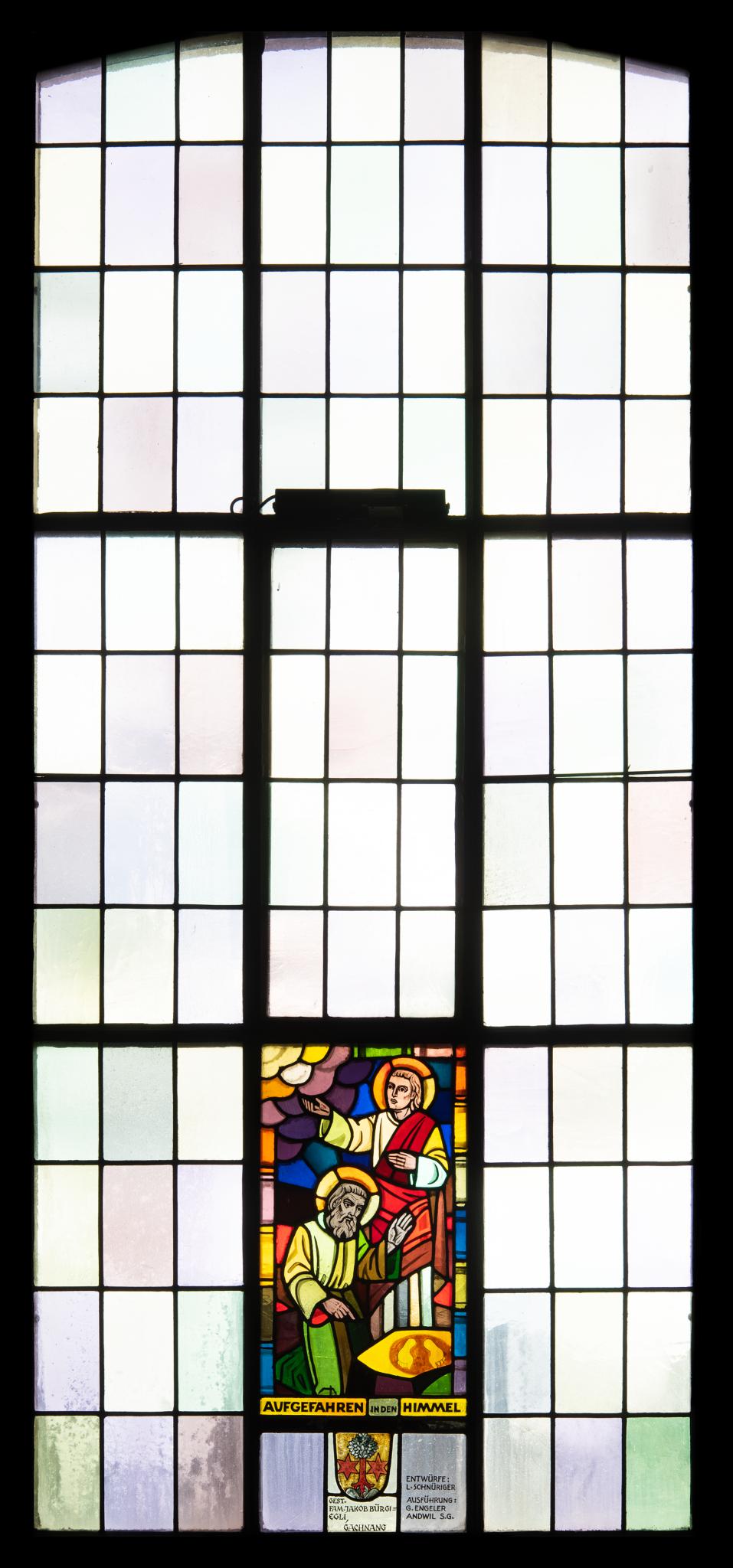 In zwölf Fenstern sind Sinnbilder des Apostolischen Glaubensbekenntnisses dargestellt. Hier ist die Himmelfahrt Christi, wie sie im Credo und in der Inschrift genannt wird, dargestellt. Christus ist in den Himmel gefahren, zurück bleiben die Apostel und die Fussabdrücke.