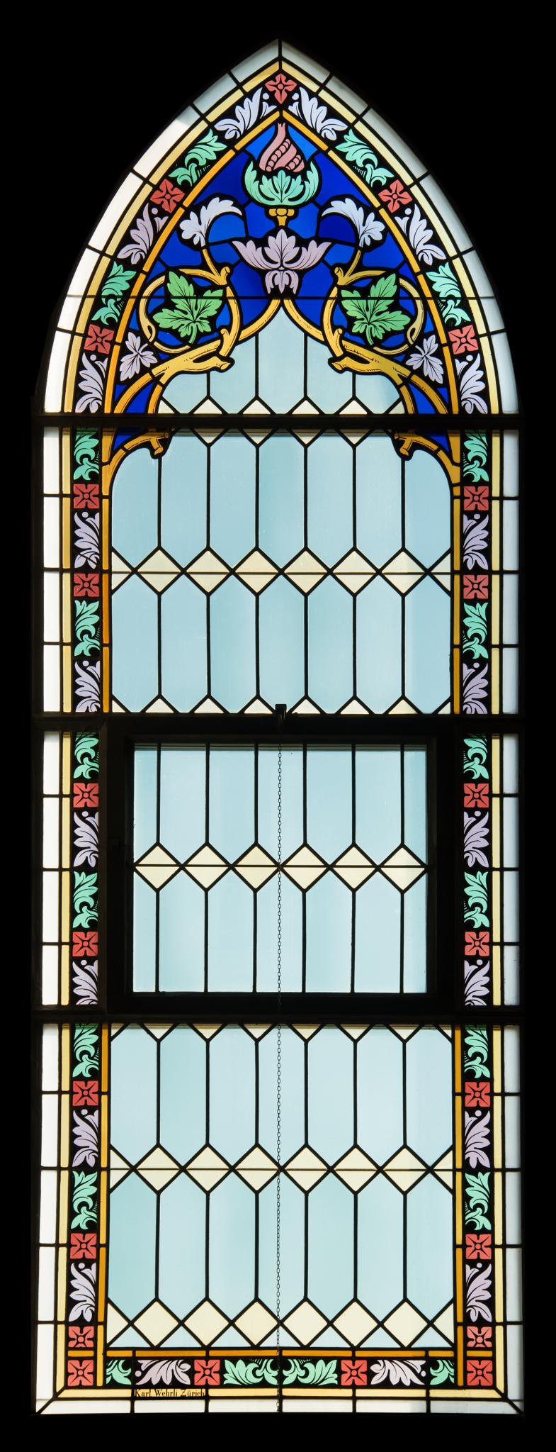 Mit grün-violett-rotem Zierrahmen eingefasstes Spitzbogenfenster. Das Mittelfeld ist in “Schweizerrauten” unterteilt, wobei die kleineren Rauten aus gelblichem Glas bestehen. Im Bogenfeld Weinblätter auf blauem Grund.