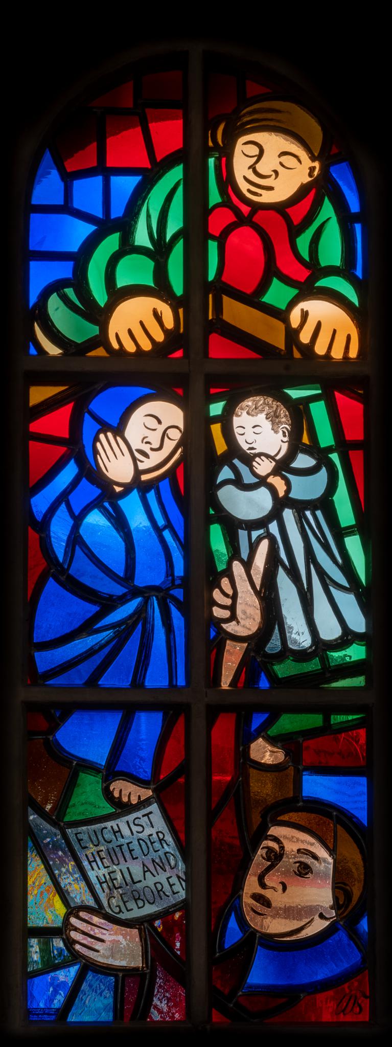 Rundbogenfenster mit Darstellung der Geburt Christi. Das Kind liegt in der Krippe neben ihm sitzen Maria und Josef. Am Scheibenfuss weist ein Engel mit ausgestrecktem Arm auf das Kind und hält die Botschaft “Euch ist heute der Heiland geboren” (Lukas 2,11) in der Hand.