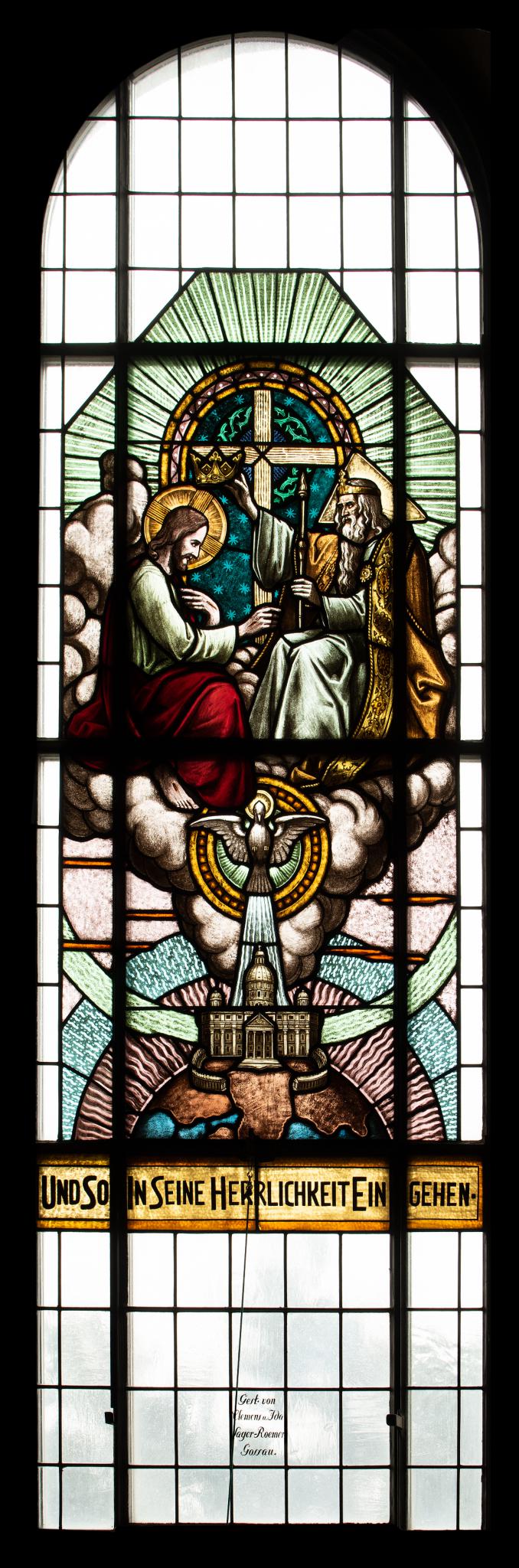 Aus einer undatierten Postkarte geht hervor, dass Lütz & Elmpt die farbigen Gläser aus dem Ruhrgebiet bezogen. Da dieses 1923 aufgrund ausstehender Reparationen von französischen Truppen besetzt wurde, rechneten Lütz & Elmpt mit Lieferschwierigkeiten: “Die Oefen werden ausgeblasen infolge der Besetzung durch die Franzosen” (Katholisches Kirchgemeindearchiv Steinebrunn-Egnach, B 17.2.04/4; Postkarte von Lütz & Elmpt, 1923). Im September 1923 erhielt die Firma eine Auszahlung von 3’800 Franken, was darauf hindeutet, dass bis dahin ein Grossteil der Fenster eingesetzt werden konnte (Katholisches Kirchgemeindearchiv Steinebrunn-Egnach, B 17.2.04/4; Brief von Lütz & Elmpt vom 13.9.1923).