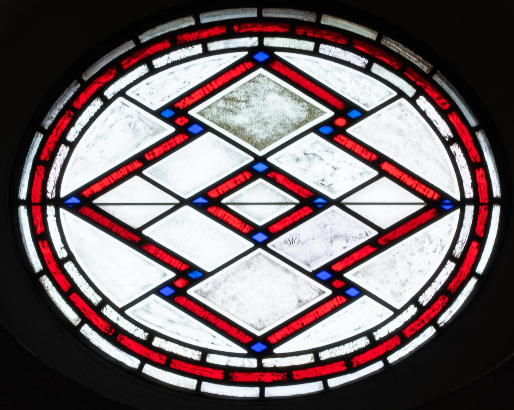 Quergelagertes ovales Fenster mit rotem Rahmen und Rautenmuster. Die Rauten werden aus roten Glasstäben gebildet, deren Eckpunkte blau sind.