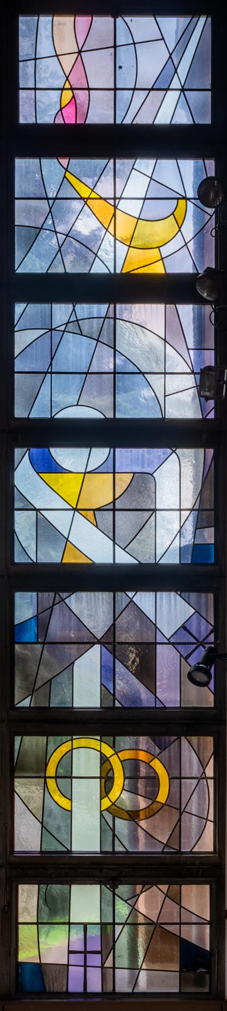 Die beiden raumhohen Glaswände im Chor zeigen mit Symbolen die sechs Sakramente. In diesem Fenster stehen Ölgefäss, Flamme und weisser Strahl für die Krankensalbung, die weiss-violette Stola und der Kelch für die Priesterweihe und die Ringe für die Ehe.