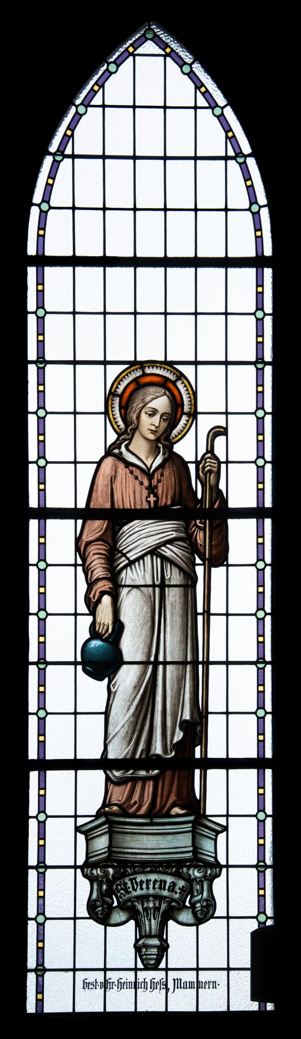 Nach dem Brand der alten paritätischen Kirche und der Auflösung des paritätischen Verhältnisses beauftragte die katholische Kirchgemeinde den Architekten Albert Rimli mit der Errichtung einer neuen Kirche. Im April 1912 legte der Architekt die im Detail ausgearbeiteten Pläne vor. Dabei kamen auch die Kirchenfenster zur Sprache. Um die beiden Figurenfenster links und rechts vom Hochalter mit einer reicheren Bemalung ausstatten zu können und dennoch einen “genügend und freundlich” beleuchten Chorraum zu erhalten, beschloss man, ein drittes Fenster auf der Nordseite des Chors einzusetzen. Um eine grössere Lichtfülle zu erzielen, empfahl der Architekt, die Schifffenster einzig mit Medaillons zu versehen (StATG, KKG 31, B.13.4.5/3, Protokoll der Sitzung der Baukommission vom 9.4.1912). Der Architekt selbst erklärte sich bereit, ein Schifffenster zu stiften und empfahl für deren Ausführung die Firma Zettler in München, vertreten durch Herrn Meyner in Winterthur (StATG, KKG 31, B.17.2.4/4, Brief von Arch. Rimli an Pfarrer Brühwyler vom 11.4.1912). Im November 1912 begutachtete die Baukommission die von verschiedenen Firmen eingereichten Skizzen. Den Zuschlag erhielten Lütz & Elmpt in Konstanz, deren Vorschläge am ehesten das Ziel erfüllten, einen möglichst hellen Kirchenraum zu erhalten (StATG, KKG 31, B.13.4.5/3, Protokoll der Sitzung der Baukommission vom 25.11.1912). Im Dezember 1912 kam es zum Vertragsabschluss. Festgelegt wurden u. A. die Preise für zwei Figurenfenster im Chor (je 400 Fr.), sechs Figurenfenster im Schiff (je 350 Fr.), drei Zierrahmenfenster (je 130 Fr.) und das Rundfenster oberhalb der Orgel (175 Fr.). Ebenfalls bestimmte man die Heiligen, die in Chor und Schiff dargestellt werden sollten. Die Fenster sollten nach Genehmigung der Skizzen bis Anfang April 1913 geliefert werden (StATG, KKG 31, B.17.2.4/2, Vertrag vom 2.12.1912 zwischen der katholischen Kirchenbaukommission Mammern und der Glasmalerei-Firma Lütz & Elmpt in Konstanz). Zuletzt wurde beschlossen, Schutzgitter für die Gemäldefenster in Auftrag zu geben (StATG, KKG 31, B.13.4.5/3, Protokoll der Sitzung der Baukommission vom 26.4.1913).
