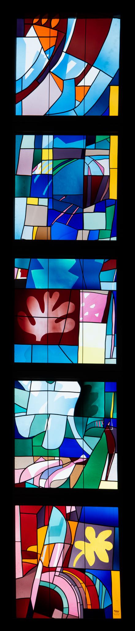 Fünfteiliges hochrechteckiges Fenster mit abstrakten Darstellungen und Blattformen.