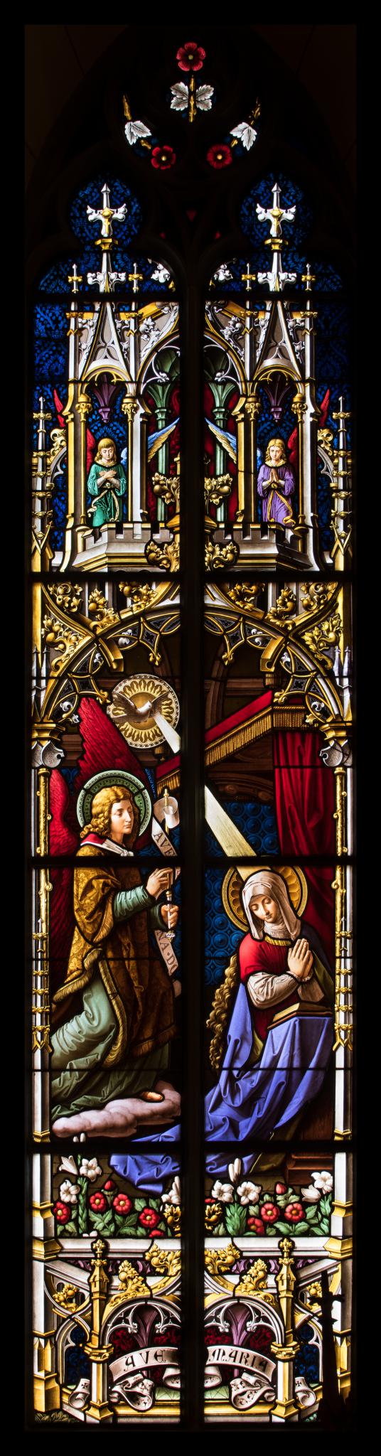 Neugotisch gestaltetes zweilanzettiges Masswerkfenster mit der Darstellung der Verkündigung in aufwändiger Rahmung mit gemalten Architekturelementen. Links der Engel Gabriel mit Botenstab auf einer Wolke, rechts die in einem Innenraum kniende, vor einem Buch betende Maria. Darüber der Heilige Geist in Gestalt einer Taube vor Strahlenkranz, den die Jungfrau treffenden Lichtstrahl aussendend. Im Vordergrund Blumendarstellungen (u. A. weisse Lilien), im Hintergrund Fenster mit Butzenscheiben. Die Rahmung im Stile der Gotik mit Fialen und Krabben, in der giebelartigen Bekrönung vor Damasthintergrund zwei kleine Engel (identisch mit n II). Im Couronnement Blumendarstellungen.