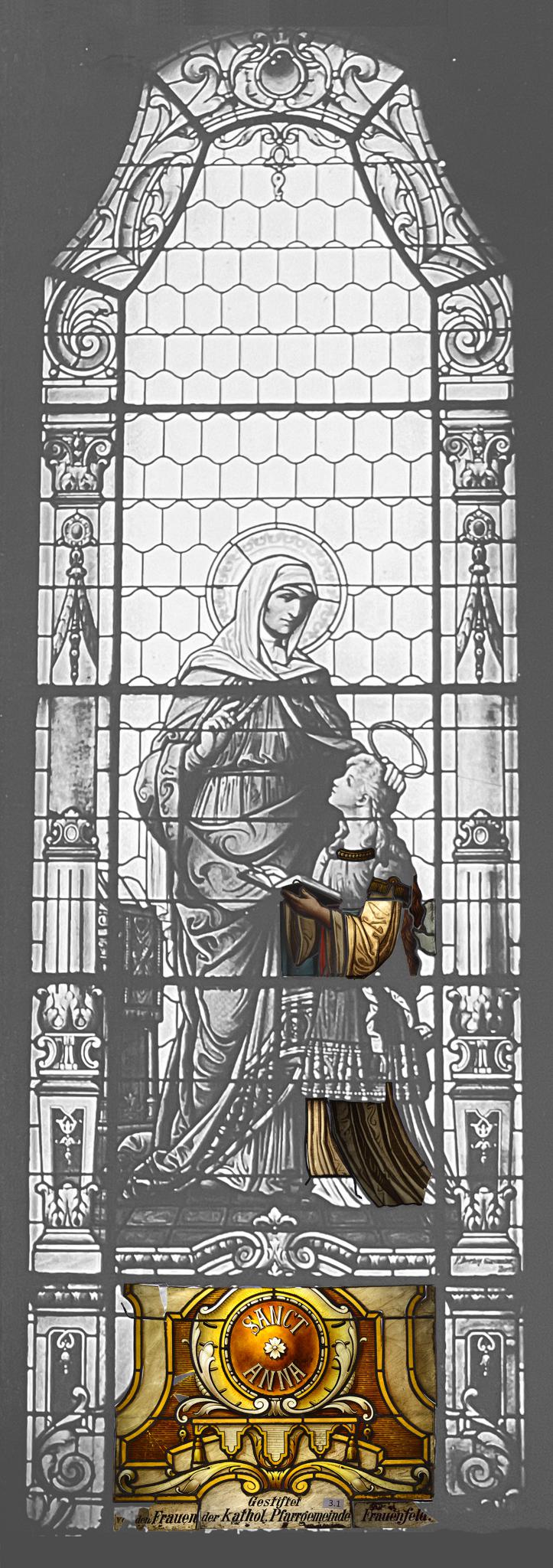 Fragmente einer Fensterverglasung mit der Darstellung der heiligen Mutter Anna mit Maria auf einem architektonisch gestalteten Sockel. Die Heilige war mit einem Schleier dargestellt, ihre Tochter Maria unterweisend. Ein breiter Rahmen mit geschmückten Säulen im Stil der Renaissance umfasste ursprünglich das ansonsten blank verglaste Fenster. Im Sockel Medaillon mit Namenszug, an der Sockelbasis Stifterinschrift. Erhalten sind Teile des Sockels und des Gewandes Marias.