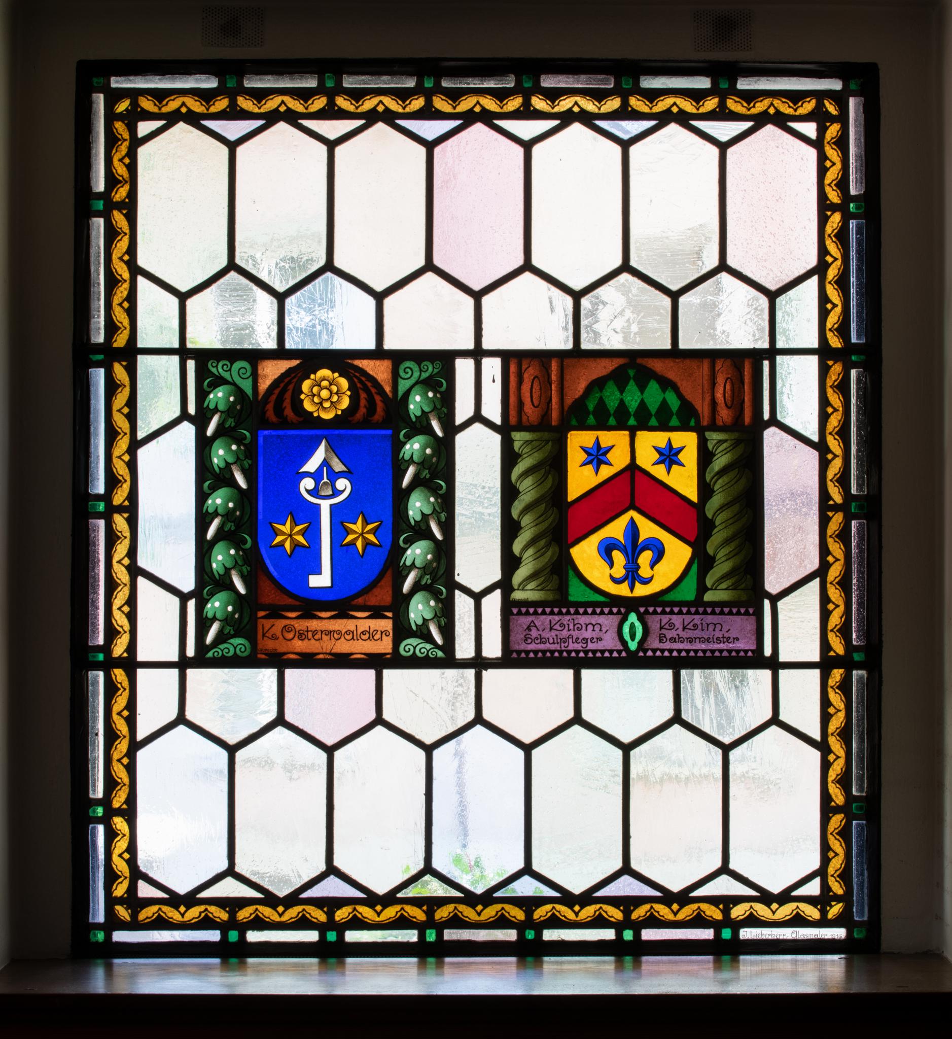 Annähernd quadratisches Fenster mit blanker Wabenverglasung und Ornamentbordüre in Gelb und Schwarz. Im Zentrum des Fensters sind zwei Glasmalereien eingelassen: die Wappen Osterwalder und Kihm, umfasst von Blumen und einer Säulenarkade.