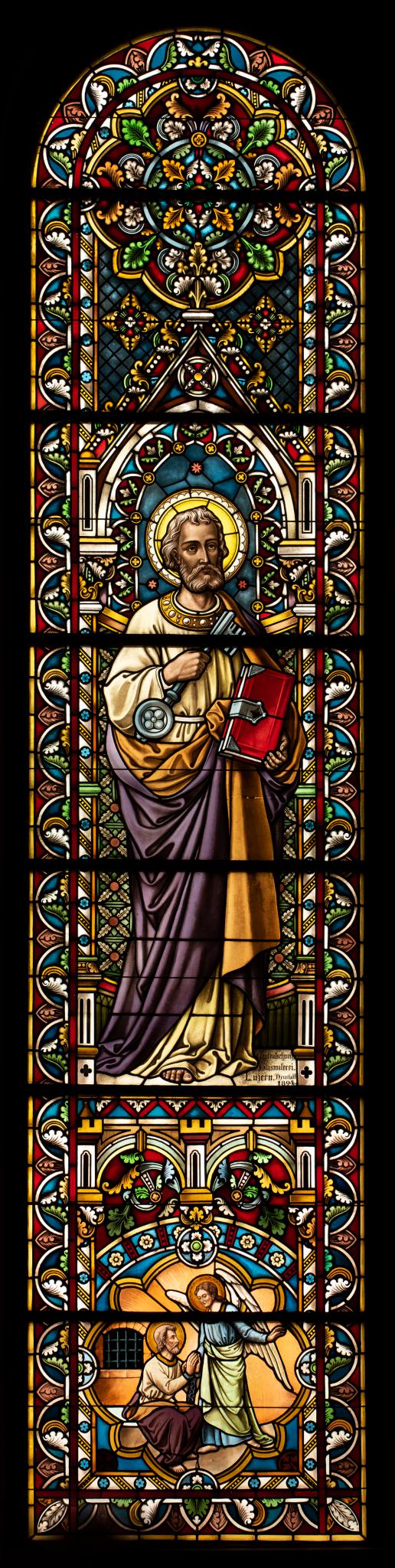 Das Petrus- und das Paulusfenster im Chor der paritätischen Kirche Basadingen wurden 1894 durch die katholische Kirchenvorsteherschaft angeschafft, welche aufgrund von eingesandten Skizzen einen Vertrag mit der Centralschweizerischen Glasmalerei in Luzern abschloss. Diese hatte die beiden Fenster bis Oktober 1894 für den Preis von 1400 Franken zu liefern (Paritätisches Kirchgemeindearchiv Basadingen-Schlattingen, B.II.2.C., Protokoll der kath. Kirchenvorsteherschaft 1873–1898, 13.5.1894). Abgesehen von der künstlerischen Ausführung der beiden Medaillons im unteren Teil der Fenster waren die Auftraggeber mit den fristgerecht eingesetzten Fenstern zufrieden (Paritätisches Kirchgemeindearchiv Basadingen-Schlattingen, B.II.2.C., Protokoll der kath. Kirchenvorsteherschaft 1873–1898, 4.11.1894). In einem Empfehlungsprospekt der Centralschweizerischen Glasmalerei von ca. 1900 wurde denn auch eine Referenz des Basadinger Pfarrers abgedruckt: “Daß die titl. centralschweizerische Glasmalerei in Luzern für die hiesige Kirche zwei Chorfenster mit schönen Figuren, die Apostel Petrus und Paulus darstellend, mit grossem Fleiß und um verhältnismäßig billigen Preis verfertigt hat, bezeugt: Basadingen, 6. Juni 1895. J. Erni, Pfarrer” (siehe Katholisches Kirchgemeindearchiv Kreuzlingen-Emmishofen, Unterlagen zum Wettbewerb um die Kirchenfenster von St. Stefan, 1901/1902). Zwar wurden die Figurenfenster in Basadingen von den Katholiken bestellt, dass als Sujets aber – wie im Zürcher Grossmünster – die Apostel Petrus und Paulus gewählt wurden könnte auf eine Absprache mit der evangelischen Gemeinde hindeuten.