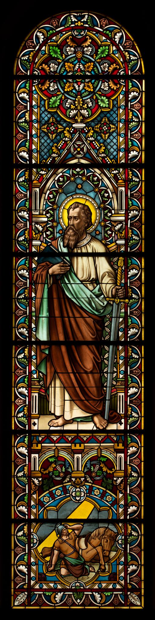 Das Paulus- und das Petrusfenster im Chor der paritätischen Kirche Basadingen wurden 1894 durch die katholische Kirchenvorsteherschaft angeschafft, welche aufgrund von eingesandten Skizzen einen Vertrag mit der Centralschweizerischen Glasmalerei in Luzern abschloss. Diese hatte die beiden Fenster bis Oktober 1894 für den Preis von 1400 Franken zu liefern (Paritätisches Kirchgemeindearchiv Basadingen-Schlattingen, B.II.2.C., Protokoll der kath. Kirchenvorsteherschaft 1873–1898, 13.5.1894). Abgesehen von der künstlerischen Ausführung der beiden Medaillons im unteren Teil der Fenster waren die Auftraggeber mit den fristgerecht eingesetzten Fenstern zufrieden (Paritätisches Kirchgemeindearchiv Basadingen-Schlattingen, B.II.2.C., Protokoll der kath. Kirchenvorsteherschaft 1873–1898, 4.11.1894). In einem Empfehlungsprospekt der Centralschweizerischen Glasmalerei von ca. 1900 wurde denn auch eine Referenz des Basadinger Pfarrers abgedruckt: “Daß die titl. centralschweizerische Glasmalerei in Luzern für die hiesige Kirche zwei Chorfenster mit schönen Figuren, die Apostel Petrus und Paulus darstellend, mit grossem Fleiß und um verhältnismäßig billigen Preis verfertigt hat, bezeugt: Basadingen, 6. Juni 1895. J. Erni, Pfarrer” (siehe Katholisches Kirchgemeindearchiv Kreuzlingen-Emmishofen, Unterlagen zum Wettbewerb um die Kirchenfenster von St. Stefan, 1901/1902). Zwar wurden die Figurenfenster in Basadingen von den Katholiken bestellt, dass als Sujets aber – wie im Zürcher Grossmünster – die Apostel Petrus und Paulus gewählt wurden könnte auf eine Absprache mit der evangelischen Gemeinde hindeuten.