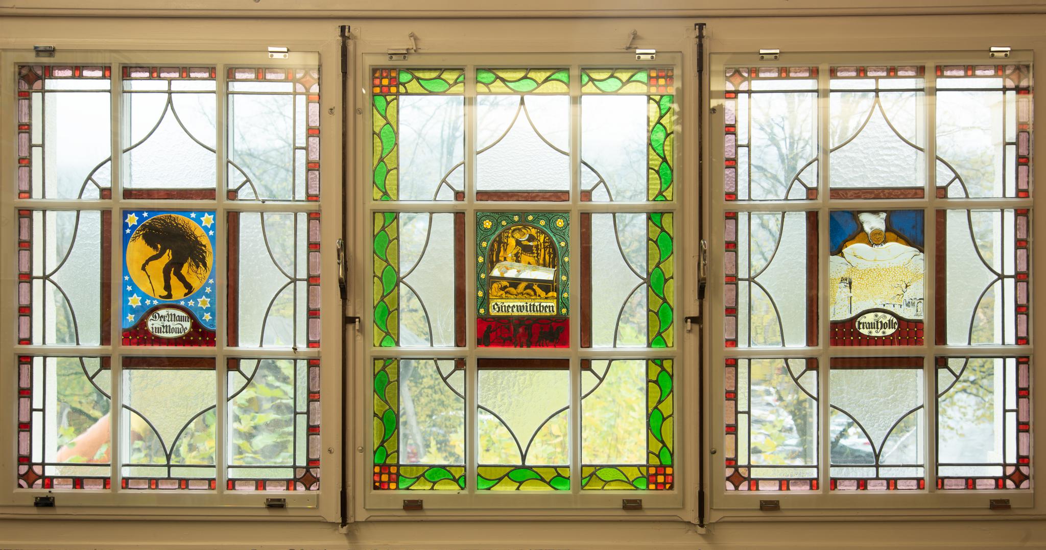 Vierteiliges Rundbogen-Sprossenfenster mit drei kleinformatigen Glasmalereien in der unteren Hälfte. Sie sind in der Art von Titelbildern für die Märchenerzählungen “Der Mann im Mond”, “Schneewittchen” und “Frau Holle” gestaltet (von links nach rechts). Die Sujets sind durch einen farbigen einfachen Rahmen akzentuiert und in eine Kartusche mit ornamental gestaltetem Rahmen eingelegt. In zwei weiteren Rundbogenfenstern des 1. Obergeschosses sind ebenfalls Märchen dargestellt (TG_1195, TG_1196).