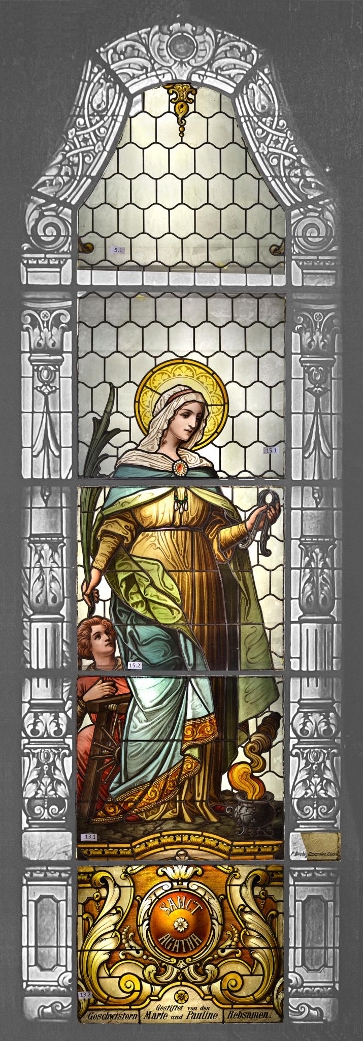 Fragmente einer Fensterverglasung mit der Darstellung der heiligen Agatha auf einem architektonisch gestalteten Sockel. Die Heilige trägt einen Schleier und ist mit der Zange in der linken Hand und dem Märtyrerzweig in der rechten Hand gezeigt. Hinter ihr kniet eine junge Person, vor ihr steht ein Gefäss, aus dem Flammen schlagen. Ein breiter Rahmen mit geschmückten Säulen im Stil der Renaissance umfasste ursprünglich das ansonsten blank verglaste Fenster. Im Sockel Medaillon mit Namenszug, an der Sockelbasis Stifterinschrift. Erhalten sind die Felder mit der Figur der Heiligen und der Sockel.