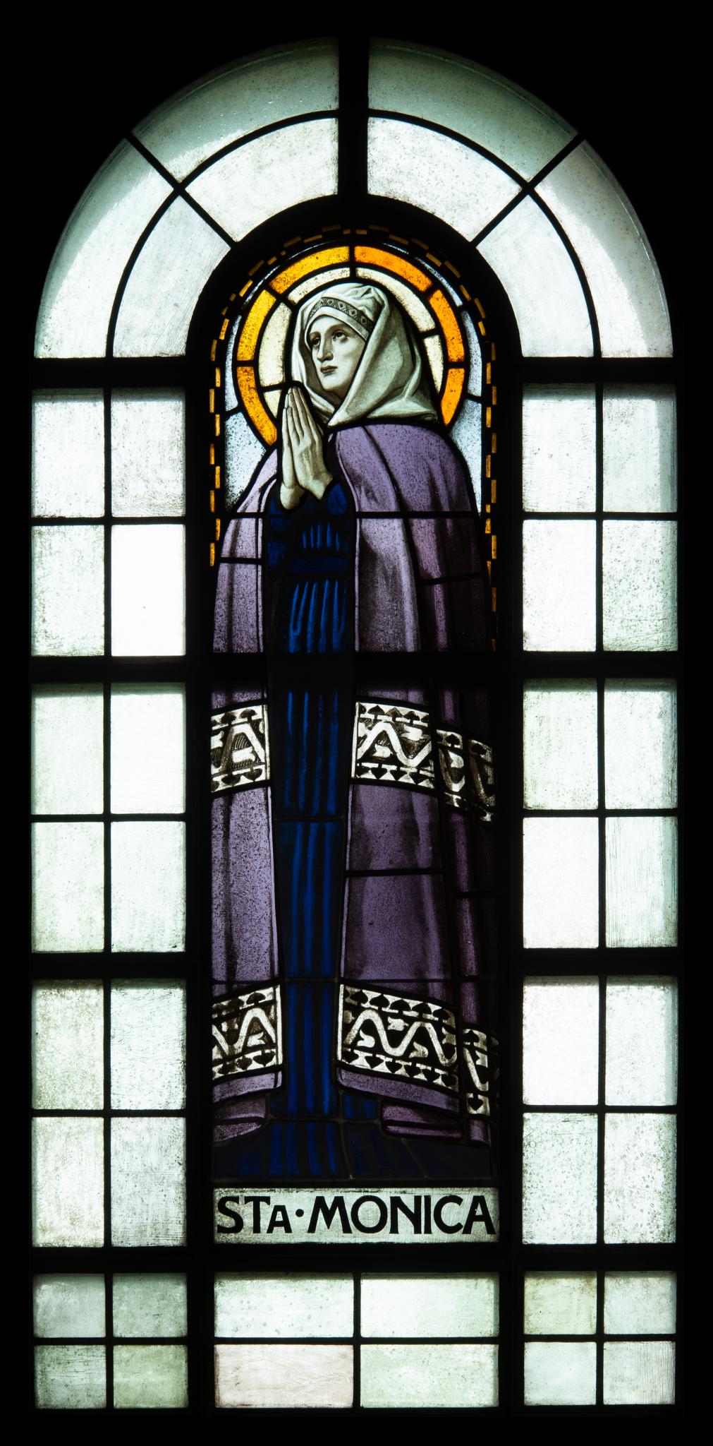 Mit opaken Rechtecken blank verglastes Rundbogenfenster mit der Darstellung der Ganzfigur der heiligen Monika in den beiden zentralen Feldern. Die Heilige ist in einem violetten Umhang und mit einem weissem Kopftuch gezeigt, ihre Hände sind zum Gebet gefaltet. Unterhalb der Figur Namenszug.