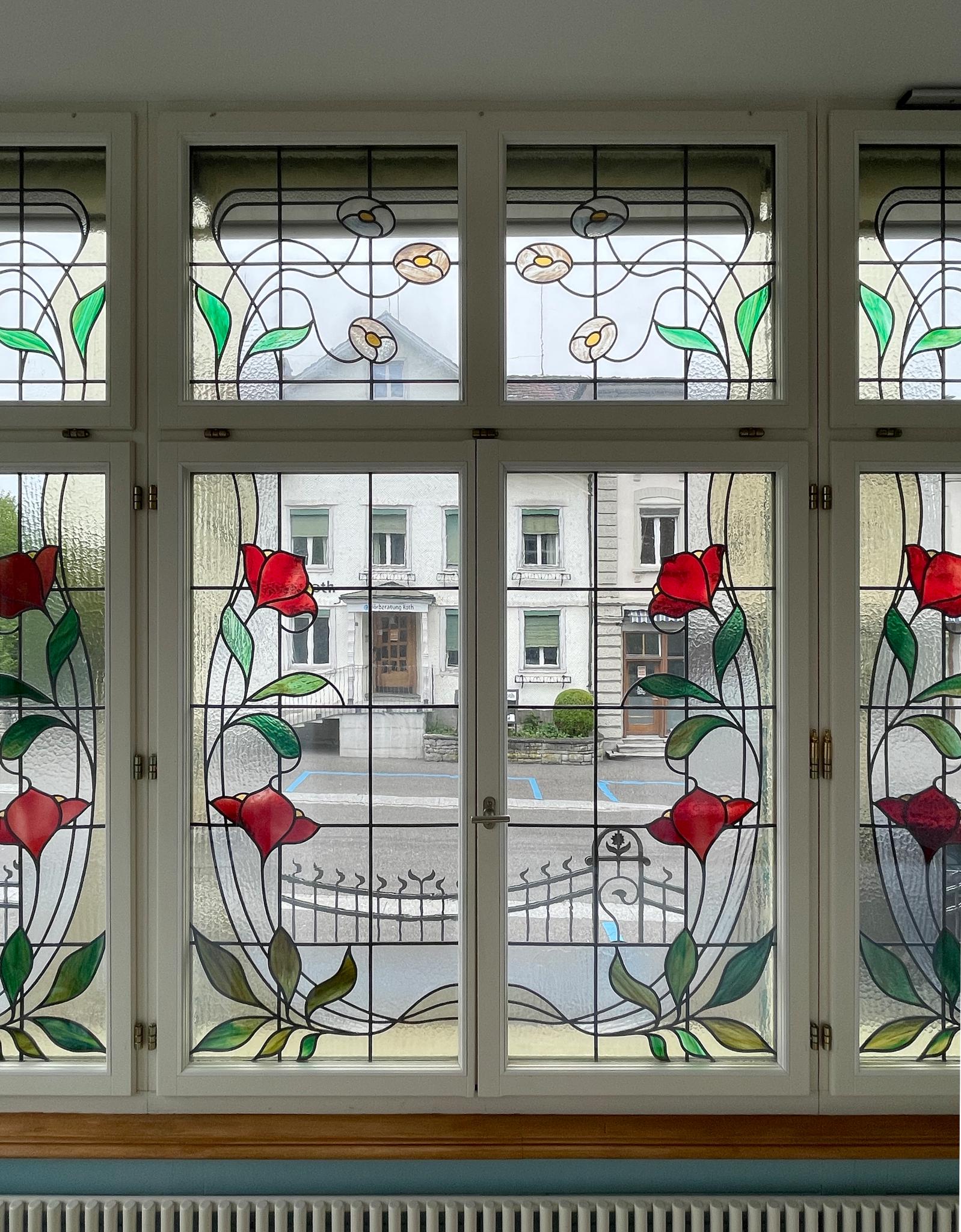 Vierteiliges rechteckiges Fenster mit stilisierten roten und weissen Blumen im Jugendstil. Teil einer Verandaverglasung aus insgesamt vier Fenstern.