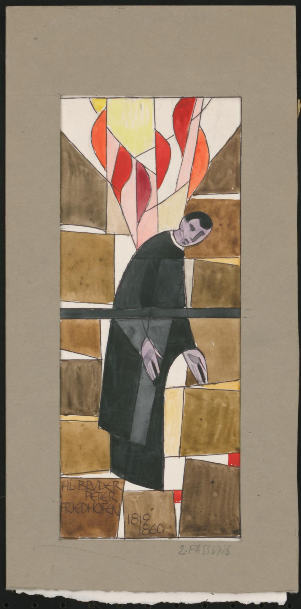 Entwurf für ein hochrechteckiges Fenster mit einer Darstellung des Heiligen Bruder Peter Friedhofen, Begründer der Barmherzigen Brüder von Maria-Hilf, im Zentrum. Gezeigt wird Friedhofen in schwarzem Habit, die Hände im Zeigegestus nach rechts unten geöffnet. Über ihm züngeln Flammen. Die Darstellung wird von quadratischen braunen Feldern gerahmt.