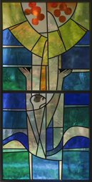 Ein Mann steht mit zum Himmel geöffneten Armen bis zur Hüfte im Wasser. Der bittende oder betende Mensch richtet sich an Christus mit blauem Nimbus, der über ihm schwebt. Christus blickt auf ihn herab und streckt ihm die Hand entgegen. Es könnte sich folglich um eine Taufszene handeln. Der Entwurf ist überwiegend in Weiss und Blautönen gehalten. Hinter Christus steht eine halbrunde Sonne am Himmel.