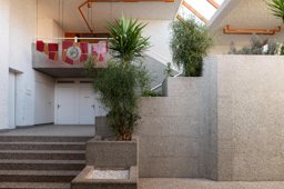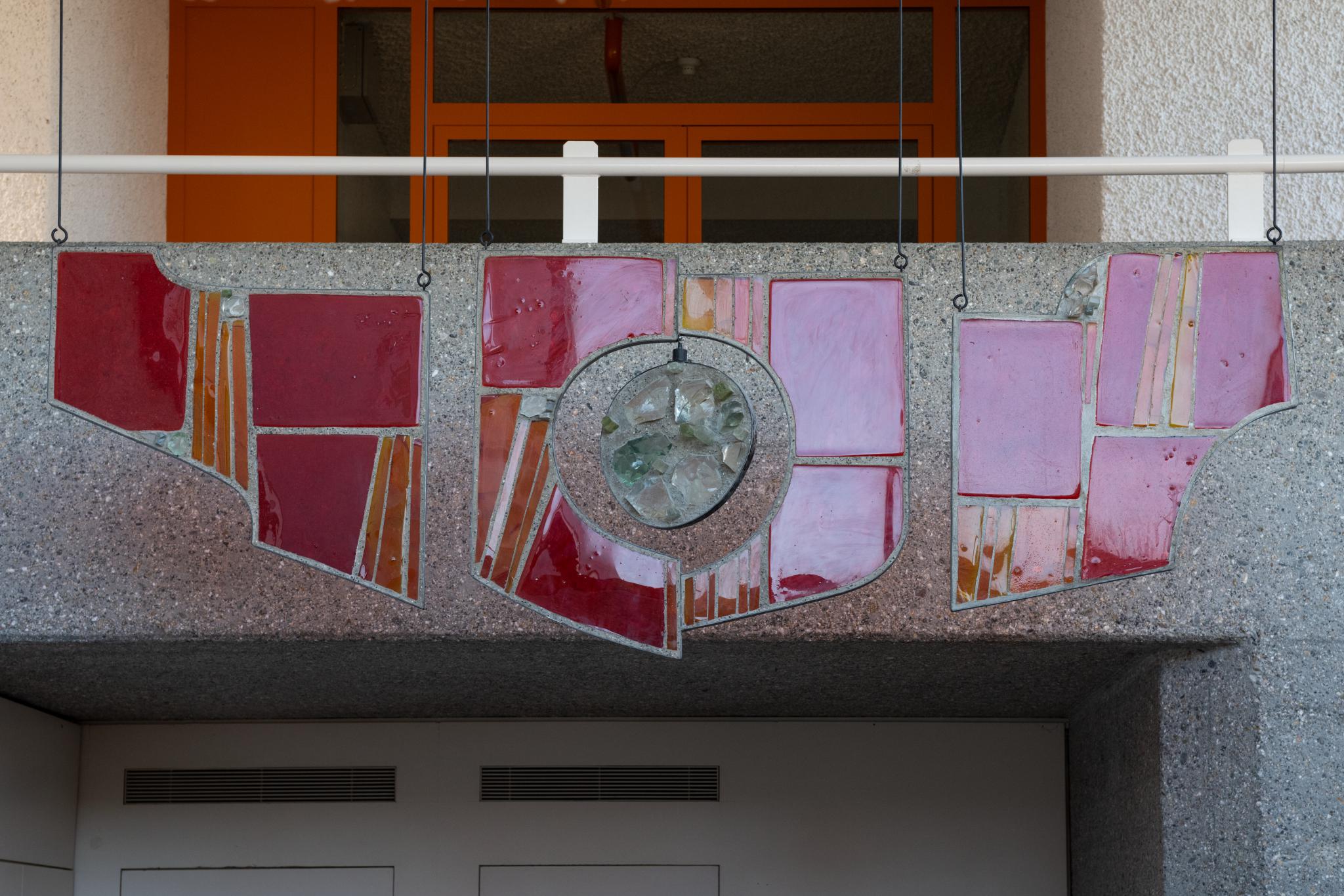 Freihängendes Betonmosaik bestehend aus drei separaten Elementen. Die drei polygonalen Elementen bestehen überwiegend aus grossen roten, rechteckigen Dallglasstücken, die mit schmalen orangefarbenen Streifen aus orangefarbenem Dallglas kombiniert sind. Das Dallglas ist in grobkörnigen Waschbeton eingelassen. Das mittlere Element bildet einen rot-orangen Rahmen um ein freidrehendes kreisrundes Element mit zugeschlagenem kristallförmigen Dallglasbrocken. Das Betonmosaik hängt auf Höhe der Treppenbrüstung im offenen Treppenhaus, das den Übergang zwischen Turnhalle und Schulhaus bildet.