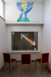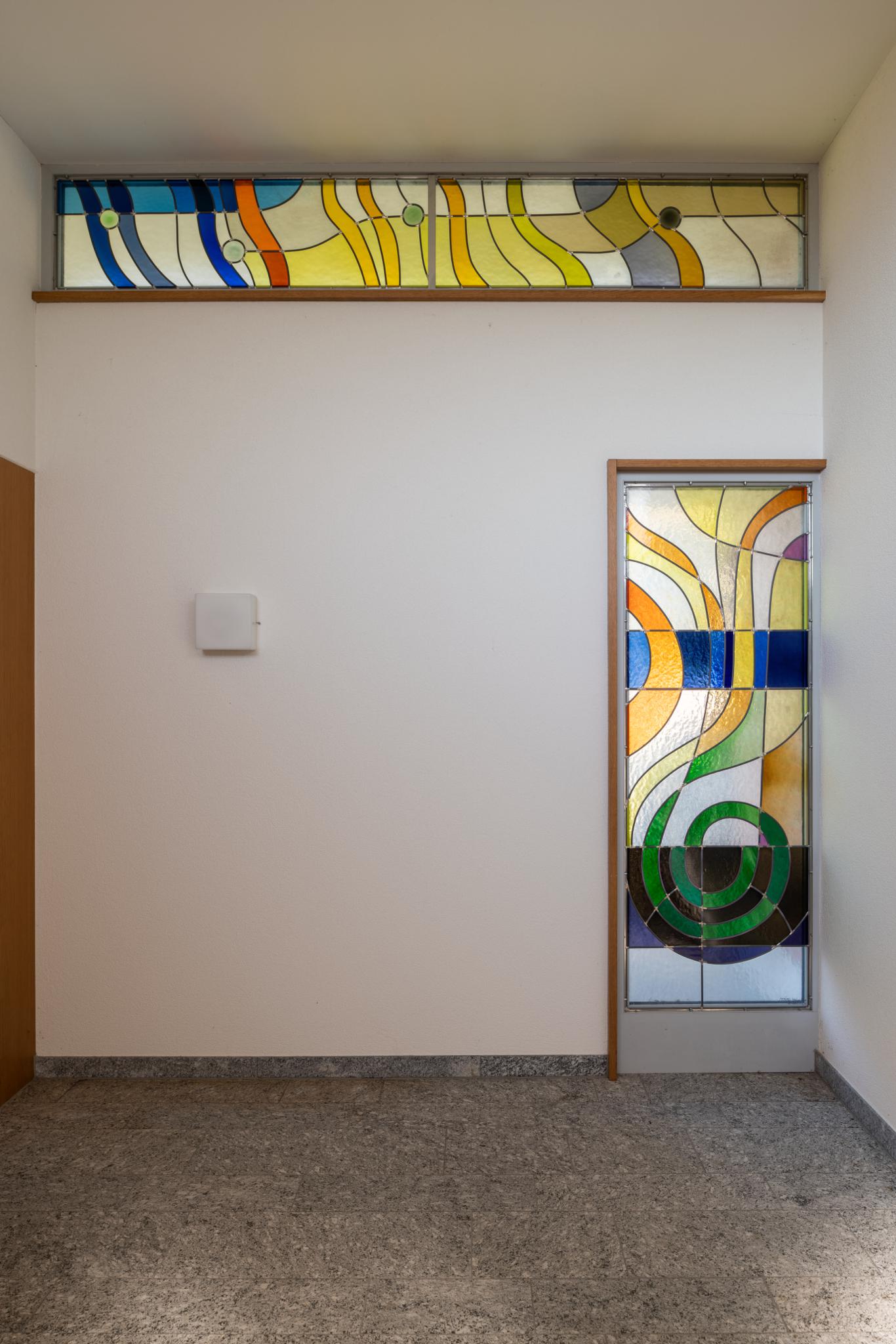 Zwei zusammengehörende Fenster mit abstrakten wellenförmigen und spiralförmigen Formen schmücken den Vorraum der Abdankungshalle. Das obere horizontale Fenster zeigt ein Netz aus vertikalen Wellenformen in Blau- und Gelbtönen sowie horizontale Linien. Die Komposition wird durch grosse kreisrundgefasste Dallglasstücke aufgelockert. Das untere vertikale Fenster präsentiert eine grüne Spirale, die sich aus einer braunen Fläche nach oben auflöst. Möglicherweise spielt die Spirale auf die Wurzel Jesse und damit den Stammbaum Christi und der Welt an. Es ist ein häufig gewähltes Symbol für Epitaphen und damit stimmig im Kontext der Abdankungshalle.