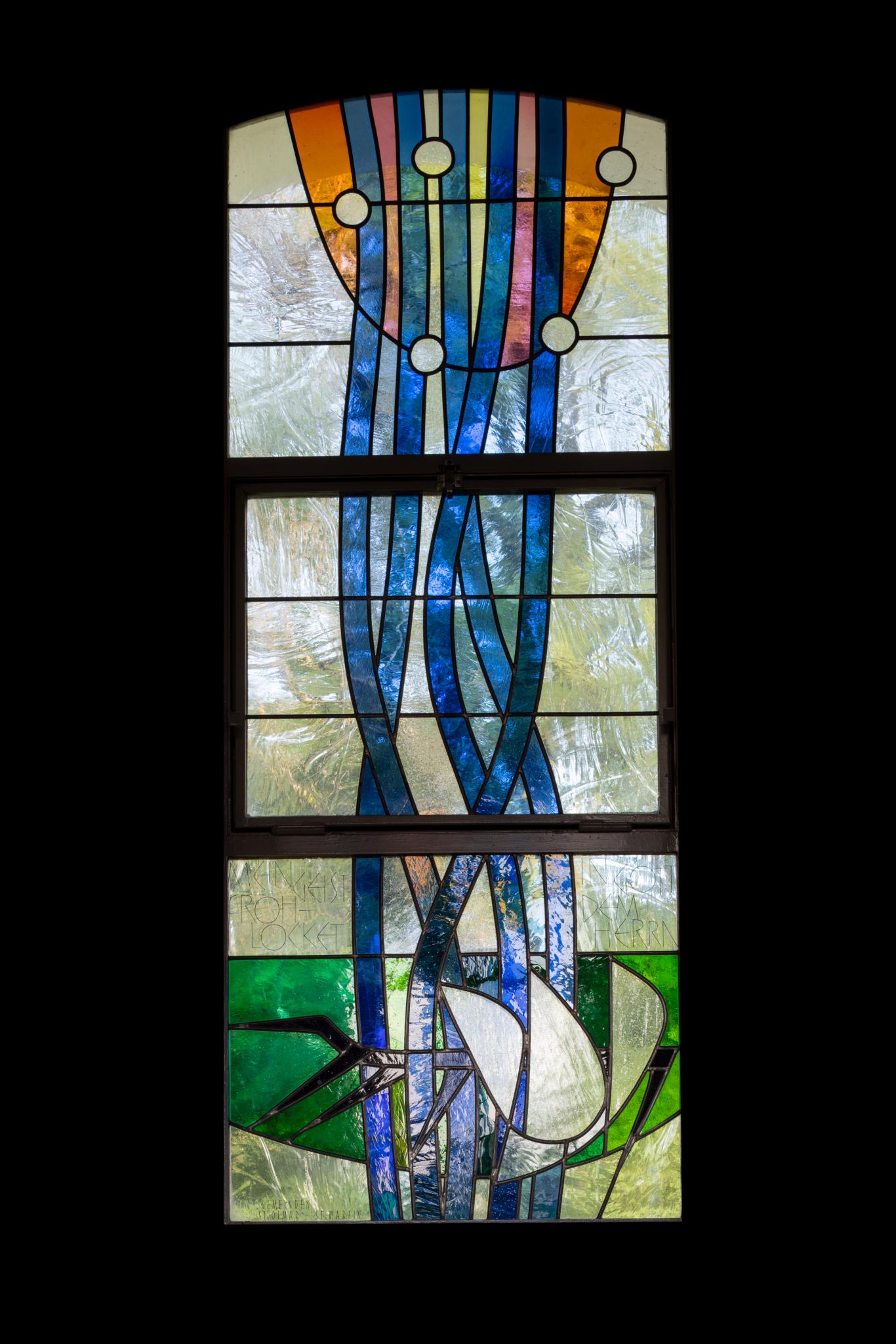 Zweifach horizontal unterteiltes Segmentbogenfenster mit der Darstellung von Regen (dünne blaue Bänder), der Sonne (orange-rosa-gelbe Form) und Sternen (weisse Punkte) auf farblosem Grund. Im unteren Drittel ein Dornzweig mit drei weissen Formen (Blättern oder Blüten) auf grünem Grund. Auffallend ist der ausgeprägte Hobel des verwendeten farbigen und farblosen Echtantikglases.