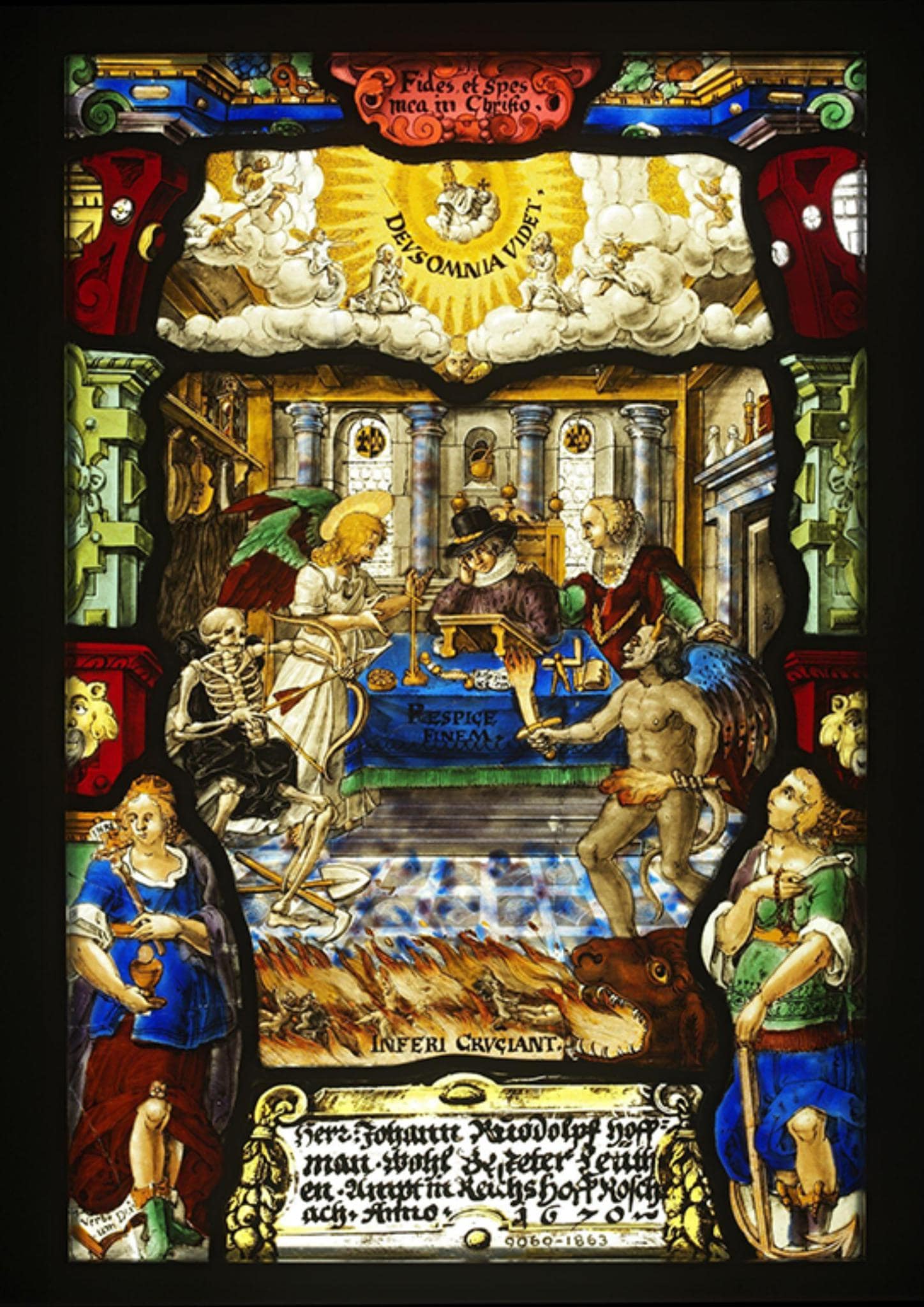 Inscription de l’image : „DEVS OMNIA VIDET“ ; „RESPICE FINEM“ ; „INFERI CRUCIANT“ ; „M. Verbum Dei„.