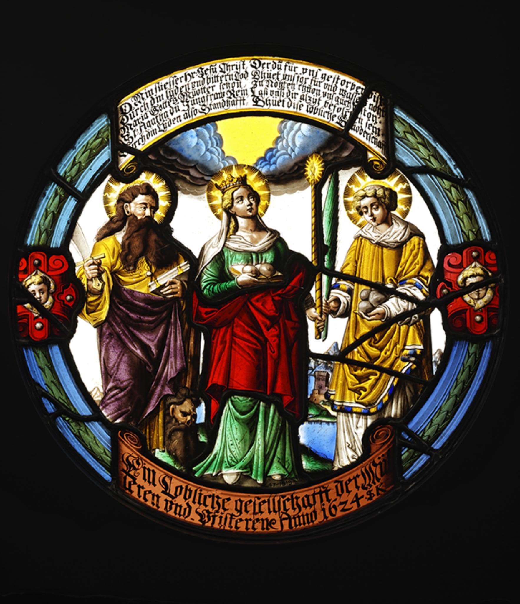 Le rondel représente sainte Agathe, flanquée de part et d’autre de saint Barthélemy et de saint Etienne. Le cartouche supérieur constitue une prière de la corporation des meuniers et des boulangers appelant le Christ, la Vierge Marie et sainte Agathe à protéger la corporation contre le feu et l’eau. L’invocation de sainte Agathe vient d’une tradition ancienne, erronée, qui croyait reconnaître en les seins de cette dernière, traditionnellement déposés sur un plateau, des miches de pains. Sainte Agathe devint la sainte patronne des boulangers, tandis que le 5 février, jour de son martyre, de petits pains sont cuits et, selon les régions, dont en Suisse centrale, suspendus dans les maisons pour les protéger de la foudre et des incendies. Les deux autres saints, saint Barthélemy et saint Etienne, pourraient en revanche être les saints patrons des donateurs, manifestement des membres de ladite corporation.