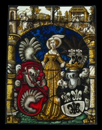 Provenant de la collection Henri Vaughan, dont les vitraux ont été légués en 1900 au Victoria and Albert Museum, le vitrail était considéré lors de son entrée dans les collections comme allemand voire suisse et daté de 1546, comme indiqué sur le cartouche central (V&A, documentation, état du 20 décembre 2013).