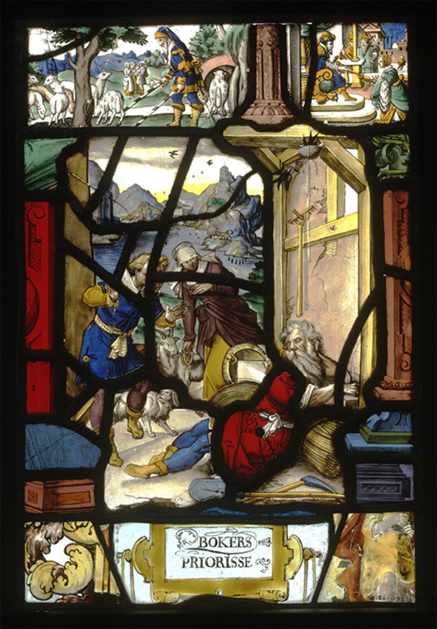 De format rectangulaire, ce vitrail, dont l’état de conservation est mauvais, se divise en trois registres : dans la partie centrale, entre deux colonnes carrées richement décorées, un homme âgé, couché à même le sol dans une grange, muni d’une pelle et d’une pioche, est surpris en train de dormir paisiblement par un jeune homme accompagné d’un chien et par une femme âgée accompagnée de chevreaux ; dans l’angle supérieur droit, un nid de moineaux dont la fiente s’apprête à tomber dans les yeux de l’homme endormi ; à l’arrière-plan figure un paysage composé d’une ville fortifiée au bord d’un plan d’eau et, à l’arrière-plan, de montagnes ; dans la partie supérieure, le cartouche d’origine a été remplacé par des compléments composés, à gauche d’une colonne, d’un homme en train de faire paître des ovins dans un paysage et, à droite de celle-ci, d’un homme couronné assis sur un trône recevant une jeune femme richemement vétûe dans un décor palatial ; dans la partie inférieure, entièrement refaite, le cartouche d’origine a été remplacé par un cartouche sur lequel est écrit en capitales „BOKERS PRORISSE“ flanqué, de part et d’autre, de motifs végétaux.