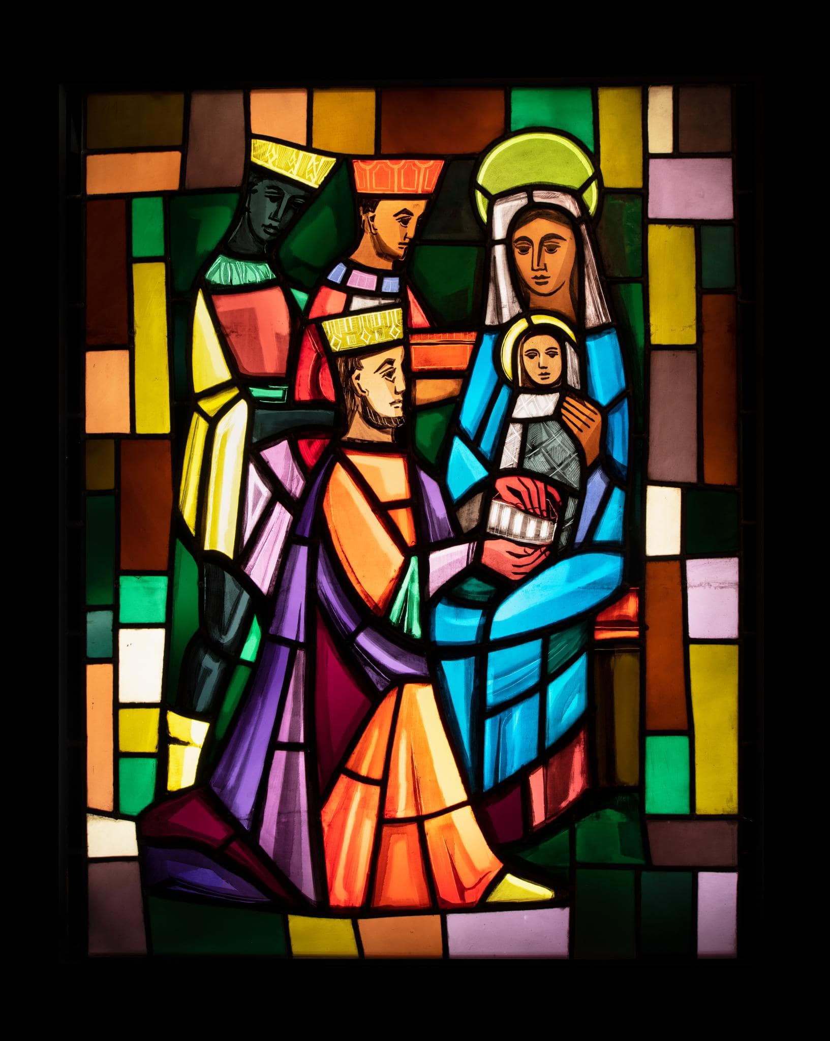 Der Zyklus für die Kapelle stellt laut Angaben des Leihgebers die glorreichen und schmerzhaften Mysterien dar. Das ausgestellte Glasgemälde zeigt mit der Anbetung der Heiligen Drei Könige eine Darstellung, die nicht zu den jeweils 5 ikonographisch überlieferten Ereignissen dieser Mysterien gehört. Sie ist jedoch essentieller Teil der Vita von Jesu, die in den Mysterien hauptsächlich behandelt wird.