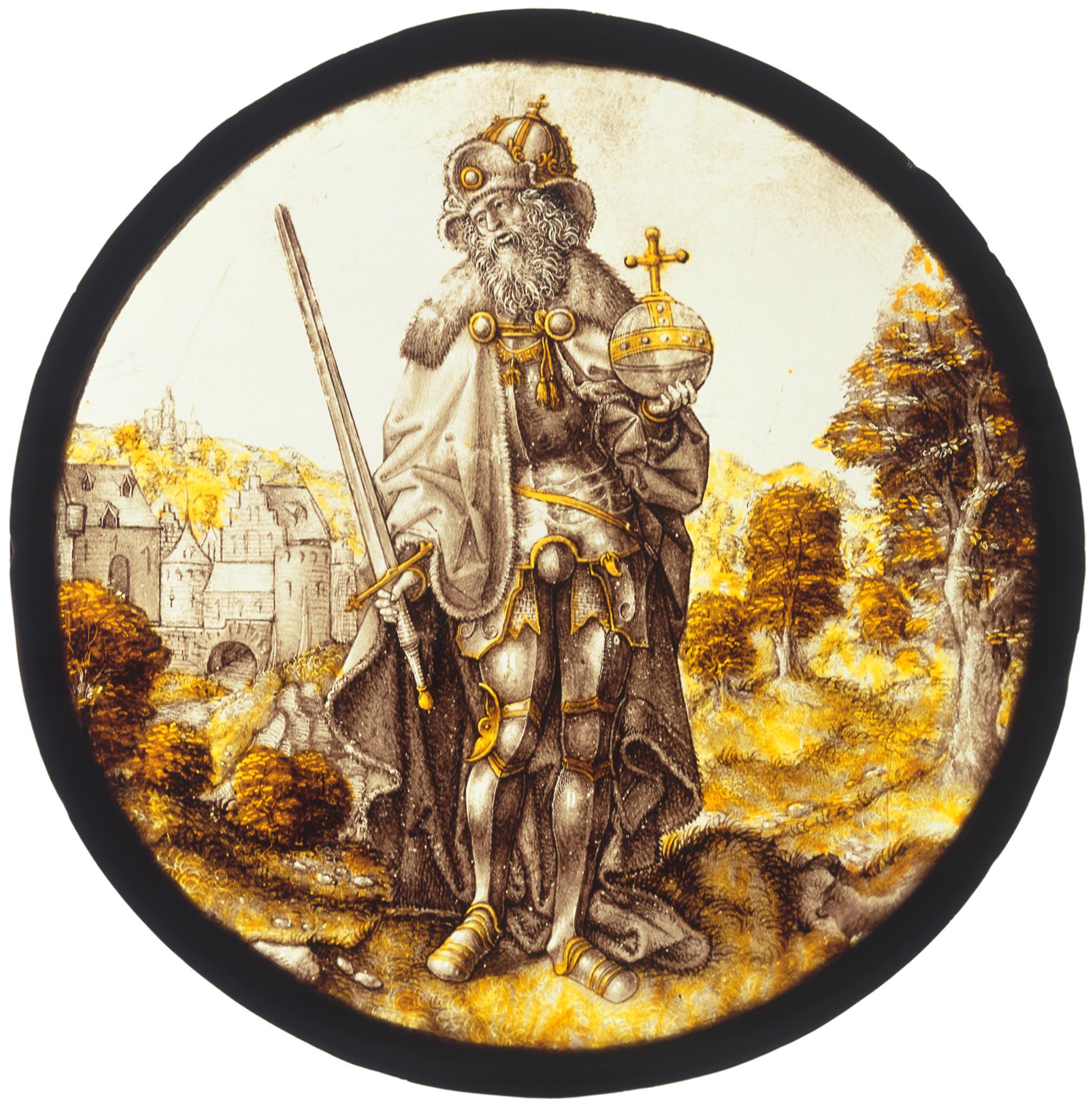La provenance de ce rondel n’est pas établie. Celui-ci est passé en vente à Zurich, chez Sotheby’s Parke Bernet & Co, le 21 avril 1984 (lot 198), puis a été vendu en novembre 2003 par la Galerie Stuker à Berne (cf. Romont, Vitrocentre Romont, Documentation, inv. VMR 10019, consultée le 4 avril 2022). Il a été acheté à cette occasion par un collectionneur établi en Allemagne qui l’a vendu en 2019 au Vitrocentre Romont, avec 28 autres pièces, toutes datant des XVe et XVIe siècles et provenant des anciens Pays-Bas voire, pour quelques-unes d’entre elles, des pays germaniques (Romont, Vitromusée Romont, documentation, inv. VMR 911, consultée le 4 avril 2022).Le rondel représente Charlemagne, roi des Francs puis empereur des Romains, dans un paysage parsemé d’arbres et d’habitations fortifiées dont les façades, à pignons à gradins (également appelés à échelons), sont caractéristiques de l’architecture gothique tardif ou de la Renaissance dans les anciens Pays-Bas ainsi que dans les pays germaniques. Roi guerrier, souverain réformateur, protecteur des arts et des lettres, Charlemagne fit rapidement l’objet d’un important culte politique, religieux et artistique dans toute l’Europe et même au-delà. Plusieurs attributs confortent cette identification : le camauro surmonté d’une mitre en forme de couronne, l’orbe crucigère et la légendaire épée.