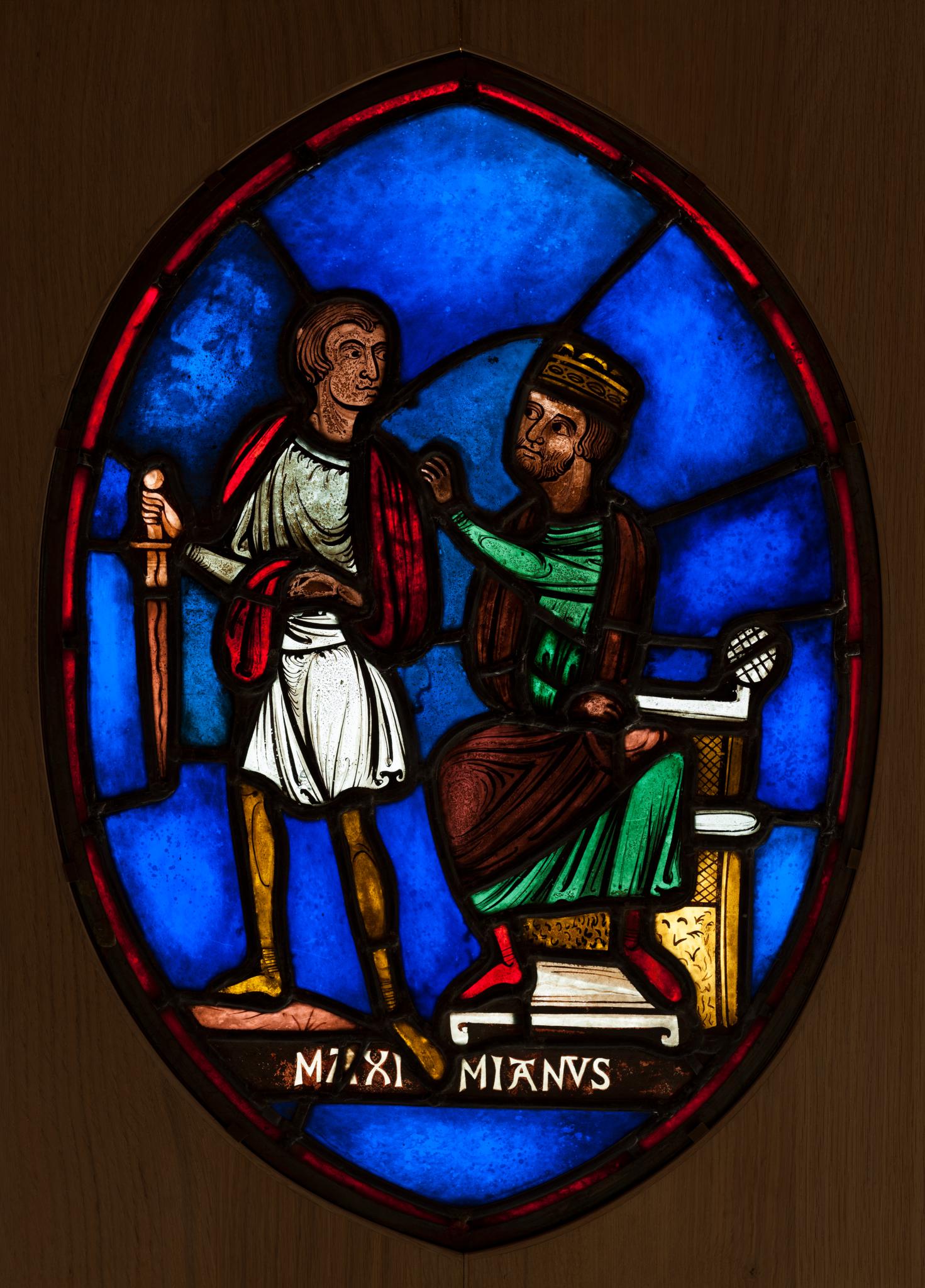 En forme de mandorle – laquelle symbolise, dans la tradition chrétienne, la plaie du Christ, ce que semble corroborer le fin encadrement rouge, plus tardif cependant –, le vitrail représente, sur un fond bleu, un trône sur lequel est assis un homme couronné, habillé à l’antique, faisant un signe à un homme en pied, également habillé à l’antique et armé d’une épée qu’il tient de sa main droite ; dans la partie inférieure figure un cartouche sur lequel est inscrit en lettres capitales le nom de l’empereur.