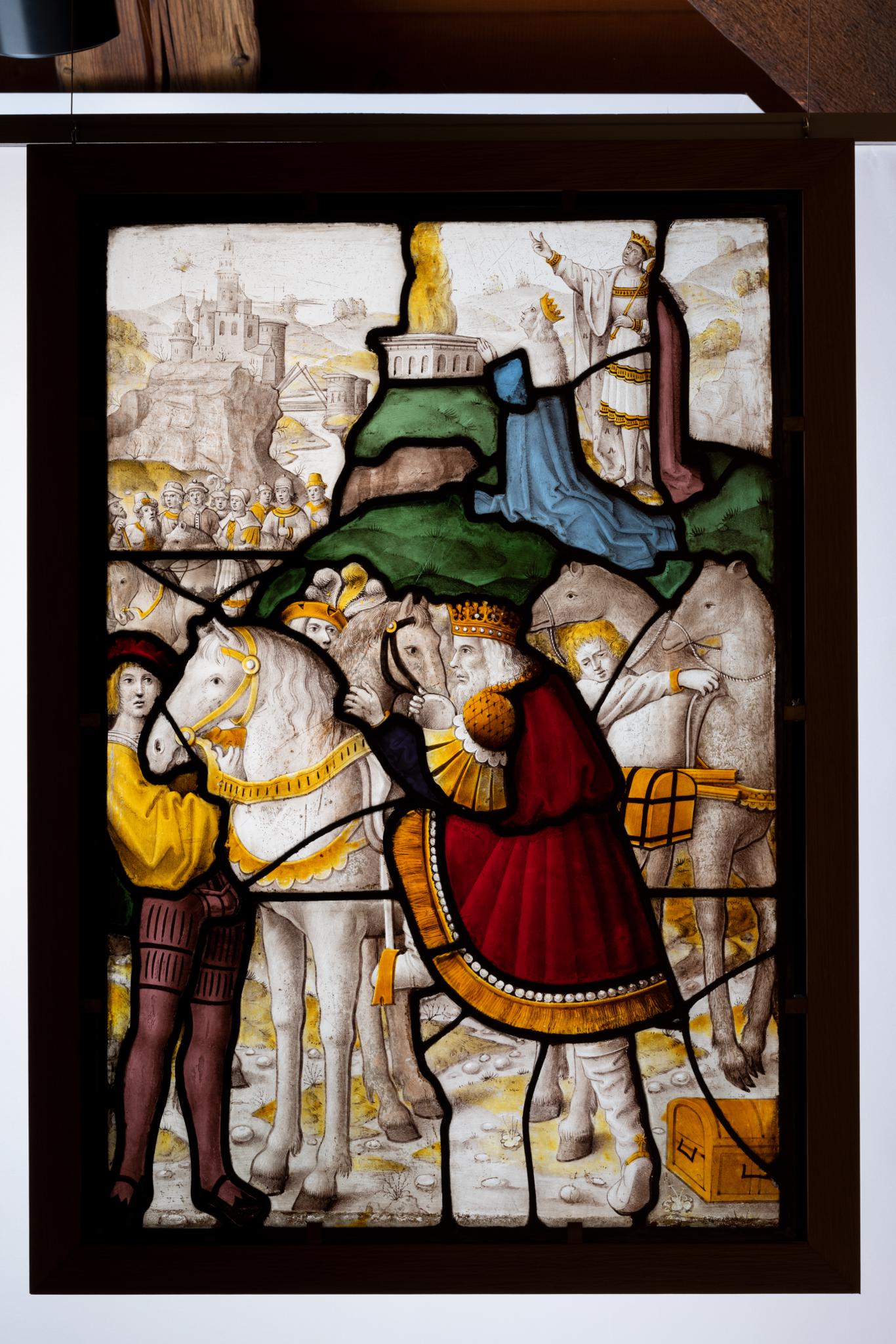 Dépourvu de cadre, le présent vitrail représente une scène dont l’iconographie n’a pu, à ce jour, être identifiée. À titre d’hypothèse, il pourrait s’agir d’une scène vétéro-testamentaire dans la mesure où le vitrail met en scène un sacrifice, plusieurs hommes couronnés (Saül, David, Salomon voire Achaz ?) et deux coffres qui pourraient constituer quelques butins. Aussi, le cloître de la chartreuse de Louvain comptait également, bien que largement minoritaires, quelques vitraux représentant des scènes de l’Ancien Testament, à l’instar de David chassé de Jérusalem (2S 16:5-14) (New York, The Metropolitan Museum of Art, inv. 17.120.14), l’arbre (ou le songe) de Jessé (Es 11:1) (Essex, Prittlewell), l’exécution d’un prophète (Cheshire, Cholmondeley Castle) ainsi que plusieurs scènes de sacrifices, également non identifiées (Essex, Prittlewell ; Essex, South Weald ; New York, The Metropolitan Museum of Art, inv. 17.120.9).