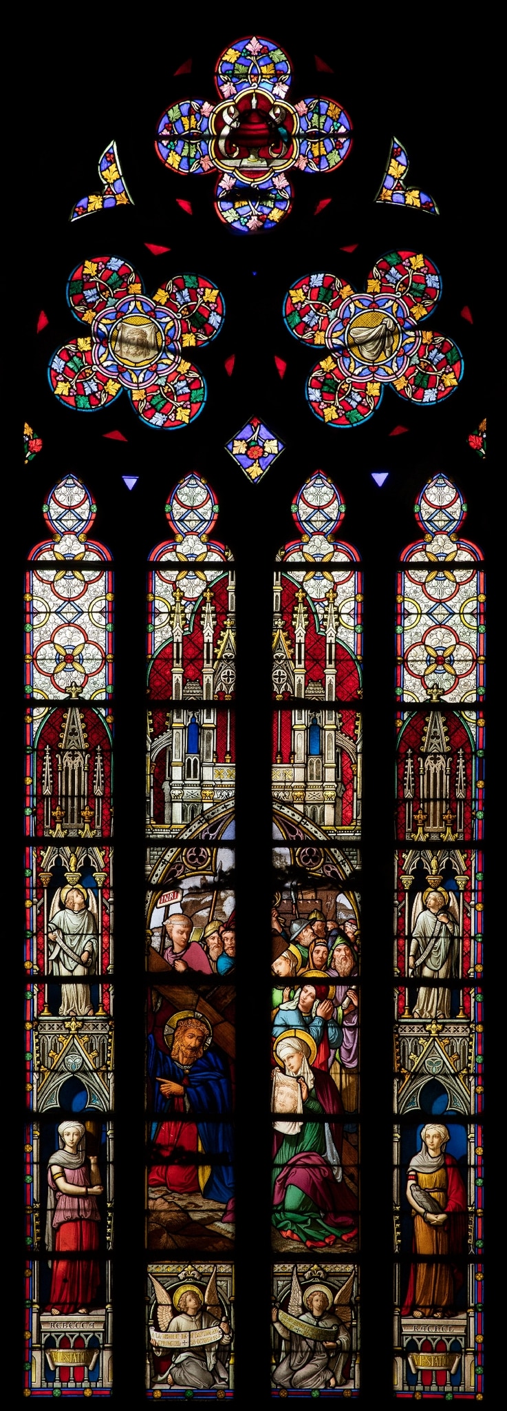 Masswerkfenster mit vier Lanzetten und Couronnement mit drei Vierpässen. In den beiden mittleren Lanzetten ist die 6. Station des Kreuzweges dargestellt: Jesus Christus trifft auf Veronika, die ihm ihr Tuch reicht, damit er sein Gesicht trocknen kann. Die Bildszene ist von einer Rahmenarchitektur im Stil der Gotik gefasst, die mit Fialen bekrönt ist. In den beiden äusseren Lanzetten sind als zur Rahmenarchitektur gehörende Statuen zwei Engel mit Schriftbändern sowie Rebekka und Rachel gezeigt. Der Sockel der Rahmenarchitektur ist mit Schriftbändern und zwei knienden Engeln geschmückt, die auf ausgerollten Schriftrollen die Stifterinschrift präsentieren. Das oberste Viertel der Lanzetten ist mit geometrischen Ornamenten, Grisaillemalerei und einer farbigen Rahmung gestaltet. In den Vierpässen sind ein Brunnen sowie zwei Leidenswerkzeuge (Schweisstuch und Grabtuch) auf ornamentiertem Hintergrund dargestellt.