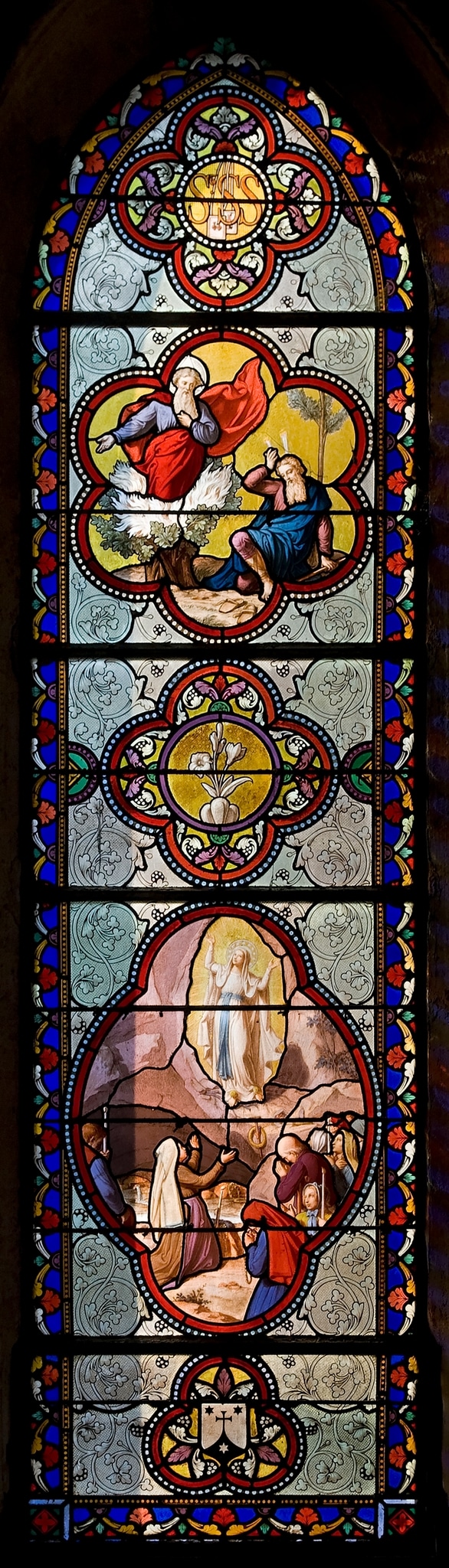 Eine von 41 Glasmalereien in der Basilika der Unbefleckten Empfängnis in Lourdes, die zu Ehren der Jungfrau Maria über der Grotte von Massabielle erbaut wurde. Dort soll die Jungfrau von Februar bis Juli 1858 insgesamt achtzehn Mal der 14-jährigen Bernadette Soubirous (1844–1879) erschienen sein. Die Glasmalereien der Kapellen in Langhaus und Chor berichten von diesen Erscheinungen und weiteren religiösen Höhepunkten in Lourdes Entwicklung zum wichtigsten Wallfahrtsort Frankreichs. Sie werden nach Eintritt in die Kirche von links nach rechts im Uhrzeigersinn gelesen. Die Glasmalereien im Obergaden von Langhaus und Chor thematisieren den Glauben an die unbefleckte Empfängnis (immaculata conceptio), von biblischen Präfigurationen bis zur Verkündung des Dogmas durch Papst Pius IX. am 8. Dezember 1854: seine Bulle Ineffabilis Deus hielt fest, dass die Jungfrau Maria ohne den Makel der Erbsünde empfangenen worden sei. Die Fenster im Obergaden werden zuerst von links zum Chor hin gelesen und danach von rechts zum Chor hin. Durch die Orgel verdeckt ist das Rosenfenster mit Mariensymbolen (?) in der Hauptfassade.