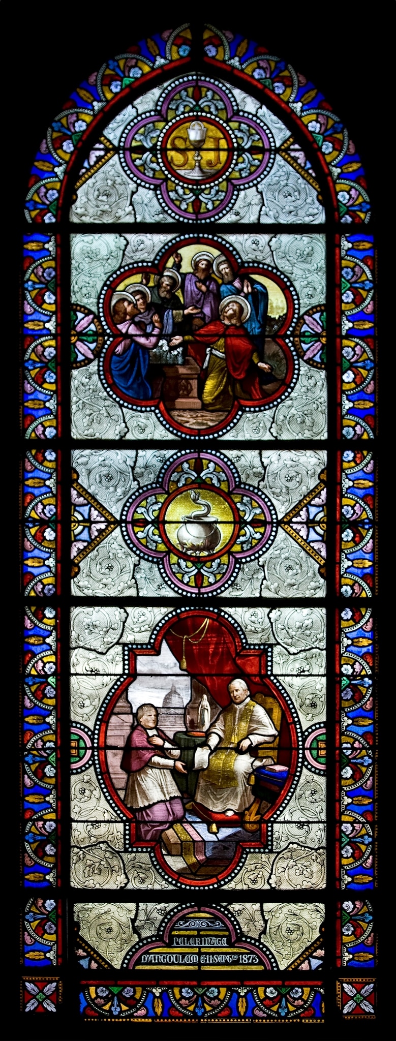 Als die Kirche 1876 geweiht wird, fehlen noch die 23 Glasmalereien der Chor- und Seitenkapellen, die den Marienerscheinungen in Lourdes gewidmet sind. Sie werden in einem dritten Schritt ab 1874 geplant und bis 1878 eingesetzt (CG_23CG_45). Lambert macht sich zuerst Gedanken zu den Sujets und sammelt Bildmaterial zur Grotte von Massabielle und zu den verschiedenen Personen, die auf den Glasmalereien möglichst exakt dargestellt werden sollen (Archives du Sanctuaire Notre-Dame de Lourdes, I B 6-2/6, I B 6-2/59, I B 6-2/4). Lambert erwähnt, wie gerne er mit Gsell zusammenarbeite: dieser sei nicht nur sehr talentiert, sondern auch bescheiden und stets offen für Änderungsvorschläge. Anfang 1876 stehen die Themen der ersten zwölf Fenster – von der ersten Marienerscheinung 1858 bis zur Anerkennung der Erscheinungen 1862 – fest. Anschliessend werden die Sujets der elf restlichen Fenster definiert – von der ersten Prozession zur Grotte bis zur Krönung der Statue der Jungfrau Maria am 3. Juli 1876. Im Herbst 1877 sind die Glasmalereien nahezu versandbereit, Gsell fehlen jedoch noch einige Angaben zu den Stiftern, die ihm Sempé nicht liefert. Nach kleineren Streitigkeiten werden die fertigen Glasmalereien im Juni 1878 nach Lourdes verschickt, wo sie ein Angestellter des Ateliers Gsell-Laurent im Juli 1878 einsetzt. Die Kosten, die Gsell in Rechnung stellt, belaufen sich auf 14’500 francs (I B 6-2/9, I B 6-2/10, I B 6-2/32). Am 13. August 1878 schreibt Gsell an Sempé: «J’ose espérer que vous ne recevrez que d’aimable compliments sur cette dernière production, pour laquelle je n’ai épargné ni zèle, ni peine, comme vous pouvez vous en convaincre et qui Dieu aidant a été conduite enfin à bonne fin» (I B 6-2/9).