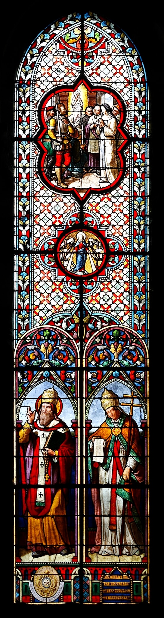 Spitzbogenfenster mit einer Bildszene in der unteren Hälfte des Fensters und darüber zwei Bildmedaillons auf einem im Stil der Gotik ornamentierten farbigen Hintergrund. Das Fenster ist Teil eines Zyklus zum Dogma der Unbefleckten Empfängnis Marias (immaculata conceptio). Der Zyklus thematisiert einerseits die Ankündigung des Mysteriums durch Präfigurationen Marias, und andererseits den Glauben an das Mysterium von seinen Anfängen bis zur Verkündung des Dogmas durch Papst Pius IX. am 8. Dezember 1854. Hier sind prominent zwei Päpste des 15. und 16. Jahrhunderts dargestellt, die für das spätere Dogma der Unbefleckten Empfängnis relevant waren: rechts Sixtus IV. mit seinen Konstitutionen von 1476 und 1483 in der Hand, in denen er die Annahme, Maria sei ohne Erbsünde empfangen worden, bestätigt; links Pius V., mit dessen Brevier von 1568 der Festtag der Unbefleckten Empfängnis Marias für die gesamte Kirche verbindlich wurde. Die beiden Päpste sind über einem architektonischen Sockel mit Ordensemblem und Stifterinschrift platziert und von schmalen Säulen und Baldachinen mit Blattranken-Dekor eingerahmt. Darüber erscheint in einem kleinen Medaillon die Jungfrau Maria in der Art, wie sie Catherine Labouré 1830 in der Rue de Bac in Paris erschienen sein soll: auf einer Weltkugel und einer Schlange stehend, mit von den Händen ausgehenden Lichtstrahlen. Im zweiten, darüberliegenden Medaillon ist Maria gezeigt, die in goldenem Licht auf einer Wolke erscheint. Sie empfängt die Huldigungen militärischer und religiöser Orden, die ihrer unbefleckten Empfängnis geweiht sind: links stehen Vertreter der Ritterorden vom Heiligen Georg, von Vila Viçosa oder vom Ordens Karls III., die unter dem Patronat der Unbefleckten Empfängnis gegründet worden waren; rechts sind Beatrix da Silva Meneses, Gründerin des Ordens von der Unbefleckten Empfängnis (Toledo 1484) und Eugène de Mazenod, Gründer des Ordens der Oblaten der Unbefleckten Jungfrau Maria (Aix-en-Provence 1816) zu sehen.