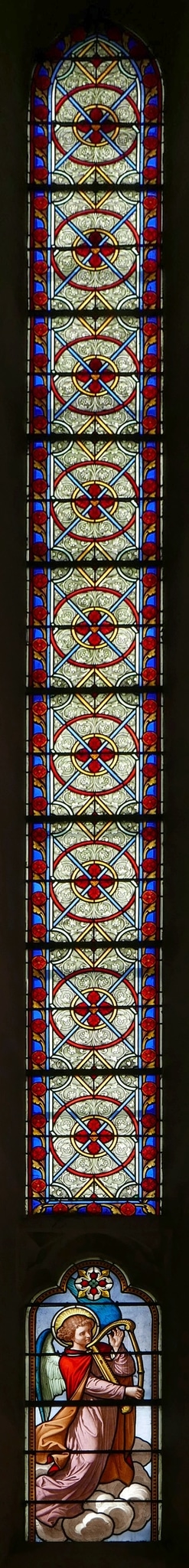 Das Chorfenster n III bauzeitlichen Glasmalerei-Ausstattung der Kirche Saint-Blaise in Sévrier, die um 1878–1881 vom renommierten Atelier Gsell-Laurent in Paris hergestellt wurde. In der Region war die Werkstatt bereits durch Glasmalereien für Kirchen in Albens (CG_226–CG_240), Chambéry (CG_241–CG_275) und Voiron (CG_286–CG_342) bekannt. Womöglich dienten diese den Auftraggebern als Anhaltspunkt für die Chorfenster: übereinstimmende Darstellungen des Evangelisten Johannes und des Apostels Andreas finden sich sowohl in Sévrier (CG_208, CG_209) wie auch in Chambéry (Cathédrale Saint-François de Sales, CG_274). Der ebenfalls im Chor gezeigte heilige Franz von Sales (CG_209) ist ebenso in Albens (Église Saint-Alban, CG_227) zu sehen; Franz von Sales, im frühen 17. Jahrhundert Bischof von Genf mit Sitz in Annecy, war in der Gegend stark verehrt und Schutzpatron der Städte Genf, Annecy und Chambéry. Um 1880 griff das Atelier Gsell-Laurent oft auf bereits vorhandene Entwürfe zurück, was auch das Hauptfenster in Sévrier (CG_207) belegt: Vergleichbare Darstellungen des Pfingstwunders sind in L’Isle-Adam (Église Saint-Martin, CG_93) und Mauron (Église Saint-Pierre) erhalten, zudem existieren Entwürfe des Ateliers für ein ähnliches Pfingstfenster in Nancy (Église Saint-Léon; siehe Musée Carnavalet, Paris, D.14638(259) und D.16190). Die Vision der Margareta Maria Alacoque, die das Couronnement des Hauptfensters ziert, findet sich übereinstimmend in Château-Chalon (Église Saint-Pierre). Trotz solcher Übereinstimmungen bilden die Chorfenster in Sévrier mit ihrer horizontalen Zweiteilung und den Engelsdarstellungen im unteren Bereich ein eigenständiges und überzeugendes Ensemble.