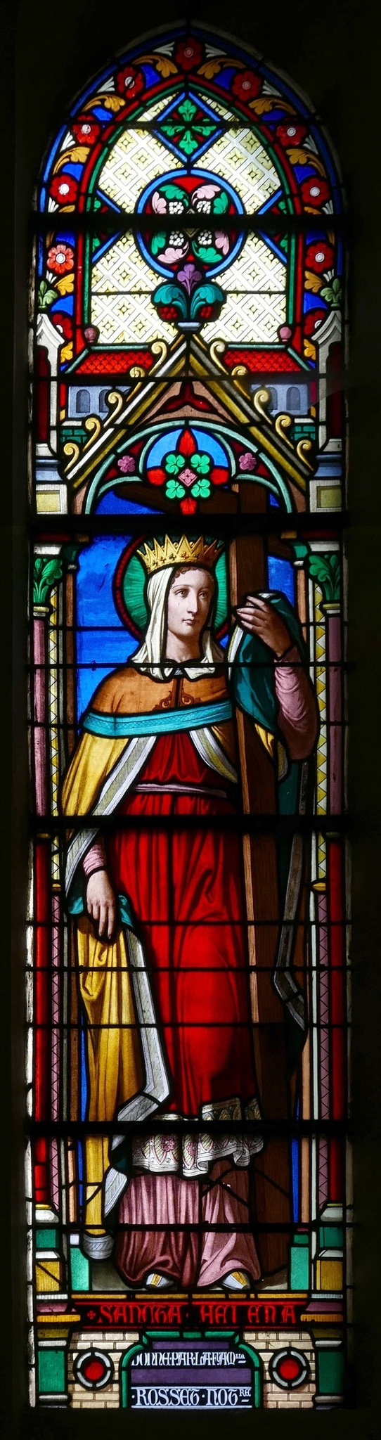 Spitzbogenfenster mit einer Darstellung der heiligen Helena von Konstantinopel als Ganzfigur. Helena trägt eine Krone und hält mit ihrer linken Hand das neben ihr stehende Kreuz Christi. Die Heilige steht auf einem Sockel, der ihren Namenszug und die Stifterinschrift trägt. Helena ist zudem eingefasst durch eine Säulenarchitektur mit Baldachin im Stil der Gotik. Die übrige Fensterfläche ist mit farbigen geometrischen Motiven und Blattmustern gestaltet.