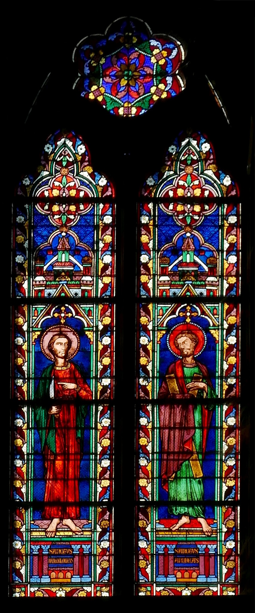 Masswerkfenster mit zwei in Nonnenköpfen endenden Lanzetten; darüber Sechspass als Couronnement. Das Obergadenfenster zeigt zwei Apostel auf blauem Grund: Bartholomäus mit dem Messer als Attribut in der linken Lanzette; Andreas mit dem Kreuz in der rechten Lanzette. Die Figuren stehen auf einem architektonischen Sockel mit jeweiligem Namenszug und sind von schmalen Säulen flankiert, über denen sich Baldachine im Stil der Gotik und je ein Vierpass erheben. Die Lanzetten haben farbige ornamentale Rahmen. Im Couronnement konzentrisch angeordnete Blüten- und Blattornamente; zudem mehrere Masswerkspickel mit farbigen Füllungen.