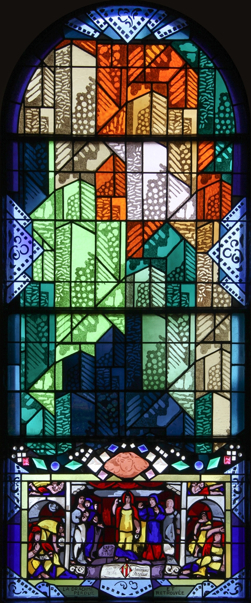 Une guirlande multicolore de cabochons et verres structurés sépare les deux secteurs, avec au centre une tête d’ange ailé inscrite dans un losange.