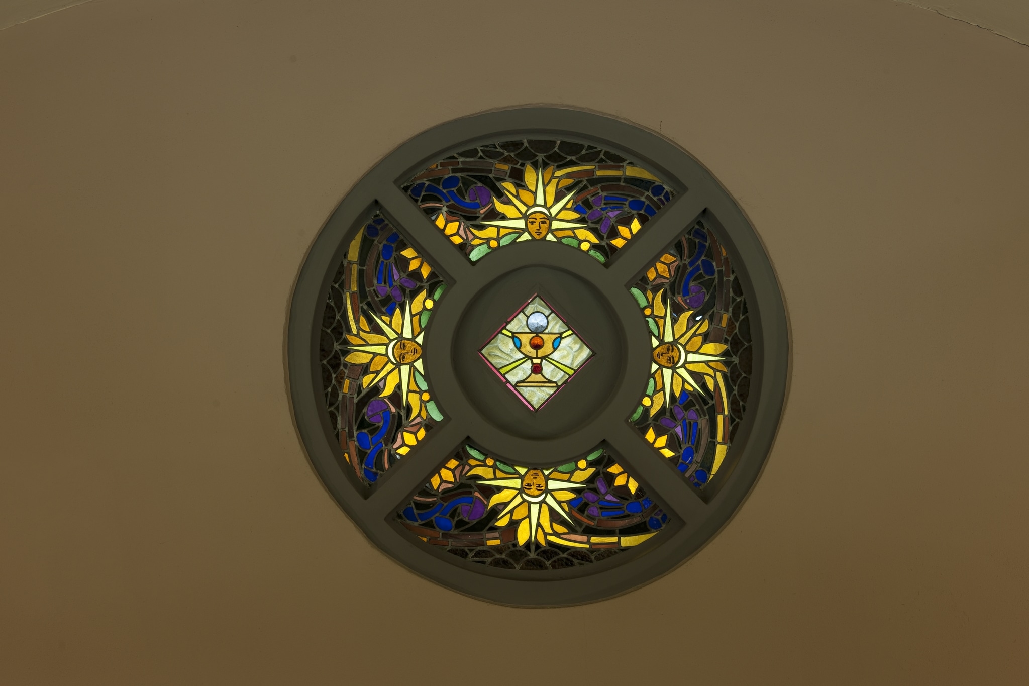 La partie centrale, la coupe de l’Eucharistie surmontée d’une hostie, qui stylistiquement diffère du reste, était à l’origine au centre d’une porte située au bas d’un escalier qui descendait du deuxième étage sur la tribune et qui n’existe plus aujourd’hui (Frère Marcel, communication par courriel, 10 septembre 2020).