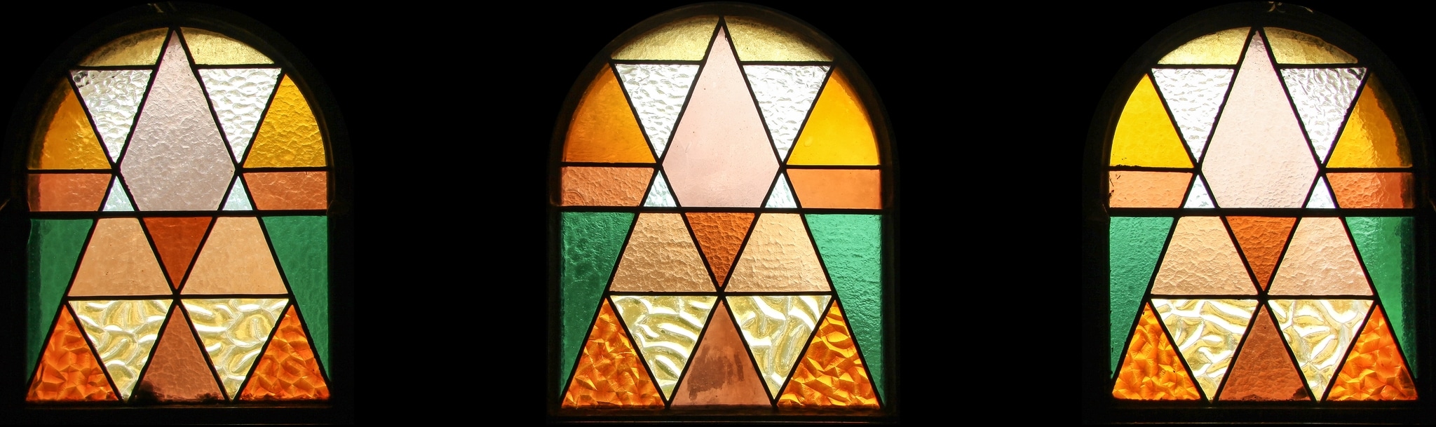 Ces trois petits vitraux dont le motif forme une sorte d’étoile irrégulière à base triangulaire sont traités de manière simple, sans grisaille, avec un jeu de textures créé par le choix des verres cathédrale et chenillés. Ils permettent de moduler et d’adoucir la lumière dispensée dans la tribune des orgues, favorisant la lecture des partitions.