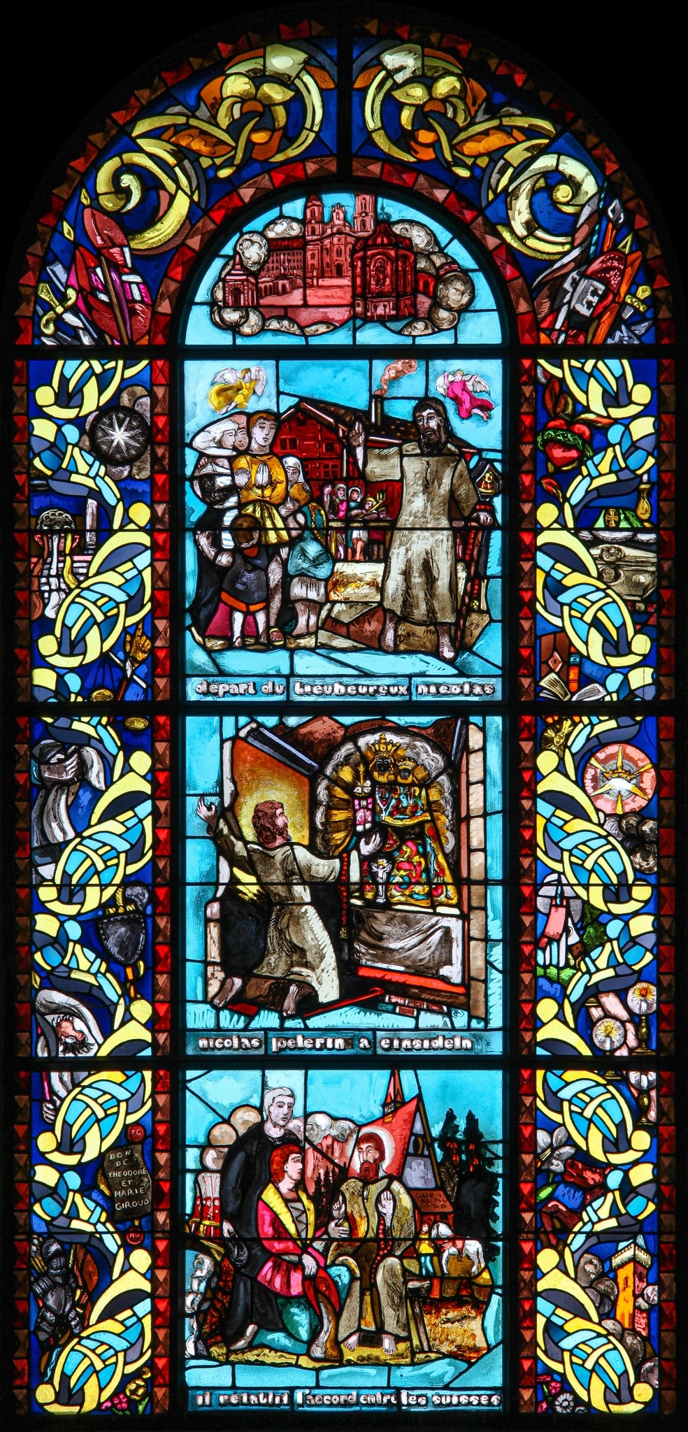 Fenêtre en plein-cintre composée, sur fond bleu ciel, de trois scènes superposées comportant chacune un épisode de la vie de saint Nicolas de Flüe, accompagné d’inscriptions les décrivant.