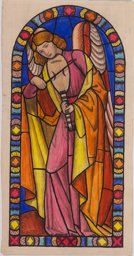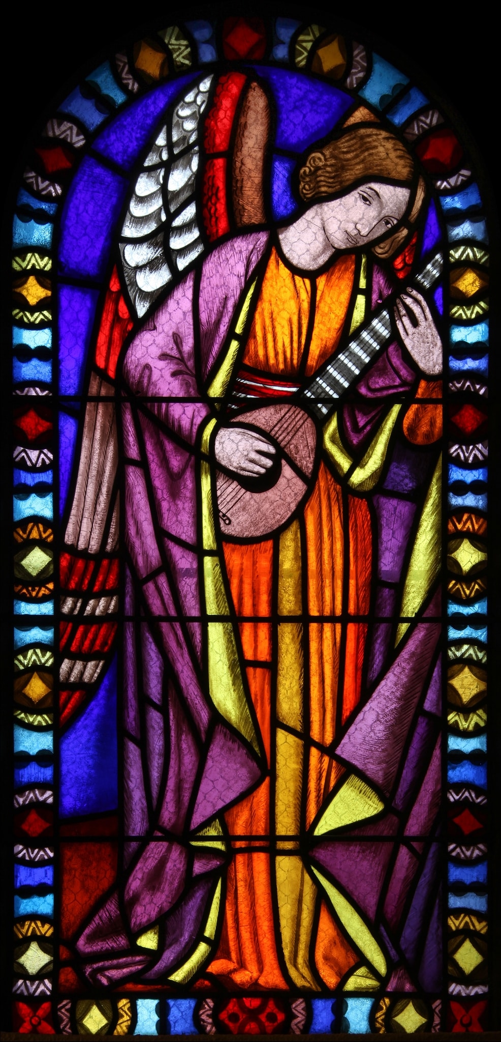 Ce vitrail en plein cintre illustre un des deux anges musiciens accompagnant sainte Cécile.