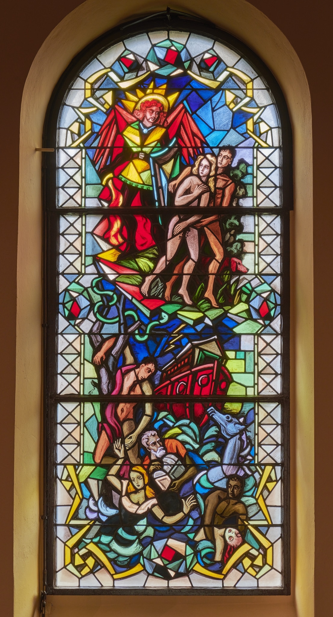 A l’exception des deux fenêtres situées au niveau de la tribune, dont les dimensions sont différentes, l’artiste conçoit ses dix fenêtres suivant un schéma identique. Deux scènes narratives très colorées sont superposées au centre de la fenêtre et ressortent sur un fond ornemental géométrique composé de verres pâles, agrémenté d’une bordure très originale ornée de motifs de pierres précieuses. Par cette construction claire et la disposition des riches coloris en un équilibre des tons chauds et froids, l’artiste assure la lisibilité du dessin malgré une iconographie complexe, allant de l’Ancien au Nouveau testament. Le cycle commence avec le deuxième vitrail situé à gauche de la nef, illustrant la Création du monde, de l’Homme et de la Femme, puis se poursuit en direction du choeur jusqu’à la Visitation. La lecture reprend à droite de la nef en direction de la tribune avec la Nativité et l’arrivée des Mages à Bethléem pour s’achever avec la Transfiguration et Pierre prêchant aux peuples du monde. Il est complété, au niveau de la tribune, par la représentation de la statue de Notre-Dame de Lausanne et du Roi David, côté nord-ouest, et de l’Agneau sur le livre aux sept sceaux avec les symboles des Évangélistes, côté sud-est. Nous ignorons si l’artiste a reçu des directives précises concernant les scènes à représenter, mais l’on peut supposer que cela a été le cas, à l’instar d’un cycle comparable par son ampleur et sa complexité, celui de Haute-Nendaz (1946) (par exemple GSL_373 ; GSL_374), pour lequel l’artiste avait travaillé sous la supervision du chanoine Marcel Michelet, docteur en philosophie et théologie (Germanier, 2000, p. 13-14).
