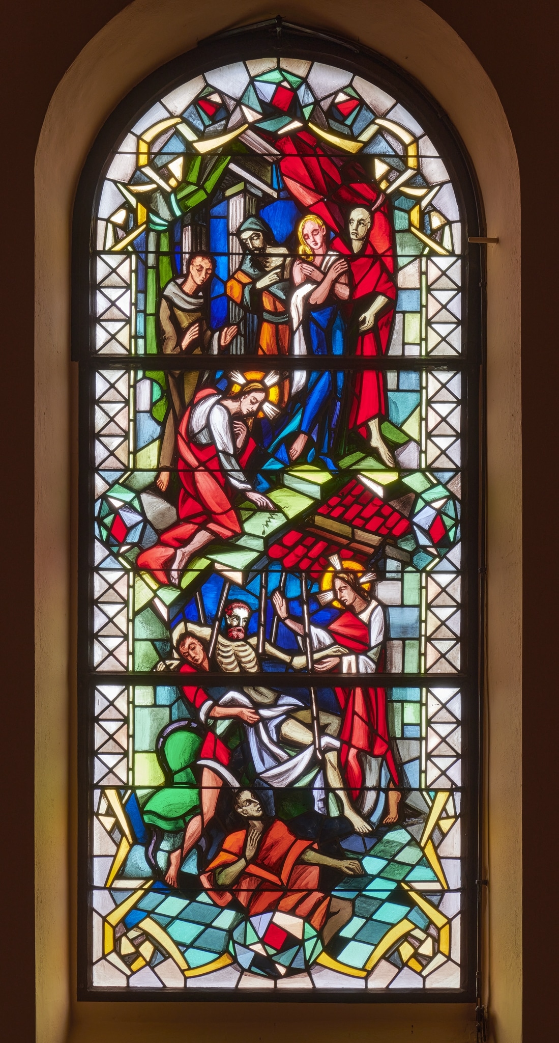 A l’exception des deux fenêtres situées au niveau de la tribune, dont les dimensions sont différentes, l’artiste conçoit ses dix fenêtres suivant un schéma identique. Deux scènes narratives très colorées sont superposées au centre de la fenêtre et ressortent sur un fond ornemental géométrique composé de verres pâles, agrémenté d’une bordure très originale ornée de motifs de pierres précieuses. Par cette construction claire et la disposition des riches coloris en un équilibre des tons chauds et froids, l’artiste assure la lisibilité du dessin malgré une iconographie complexe, allant de l’Ancien au Nouveau testament. Le cycle commence avec le deuxième vitrail situé à gauche de la nef, illustrant la Création du monde, de l’Homme et de la Femme, puis se poursuit en direction du choeur jusqu’à la Visitation. La lecture reprend à droite de la nef en direction de la tribune avec la Nativité et l’arrivée des Mages à Bethléem pour s’achever avec la Transfiguration et Pierre prêchant aux peuples du monde. Il est complété, au niveau de la tribune, par la représentation de la statue de Notre-Dame de Lausanne et du Roi David, côté nord-ouest, et de l’Agneau sur le livre aux sept sceaux avec les symboles des Évangélistes, côté sud-est. Nous ignorons si l’artiste a reçu des directives précises concernant les scènes à représenter, mais l’on peut supposer que cela a été le cas, à l’instar d’un cycle comparable par son ampleur et sa complexité, celui de Haute-Nendaz (1946) (par exemple GSL_373 ; GSL_374), pour lequel l’artiste avait travaillé sous la supervision du chanoine Marcel Michelet, docteur en philosophie et théologie (Germanier, 2000, p. 13-14).